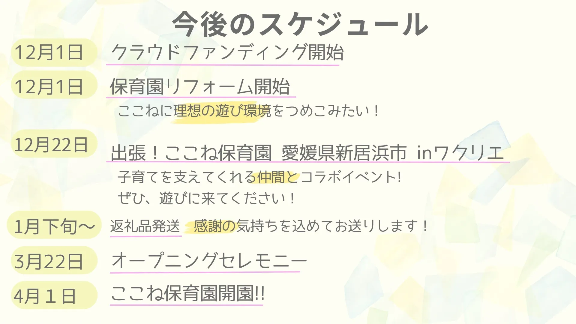 2025/04/07 00:23【ついに、4月1日 保育スタート!】0から始まった ここね保育園 が、たくさんの想いと応援に支えられてついにスタートしました!クラウドファンディングやご寄付を通して「未来を育てたい」と願ってくださった皆さんのおかげで、子どもたちがのびのび遊べる園庭が完成しました。小さな築山のある、自然豊かな園庭。これから子どもたちの遊びによって、どんどん進化していきます!泣いて、笑って、悩んで、考えて…子どもたちが「生きてて楽しい!」と感じられるそんな毎日をつくっていきます。すでに園には、笑顔があふれています。この場所が、子どもたちの“心の根っこ”を育む、あたたかい居場所になりますように。そして——この園は、決して私ひとりでは作れませんでした。そっと背中を押してくれたあなた。一緒に走ってくれたあなた。心から、ありがとう。「応援してよかった」そう思っていただけるように、これからも、大切に育てていきます。* * *返礼品としてお約束していたお礼のお手紙の発送が遅れており、申し訳ありません。一通一通、想いを込めてお届けしたくて…時間を作りたいと思いながら、日々の保育に追われていました。お待たせしてしまい本当にごめんなさい。今しばらく、お時間をいただけたら嬉しいです。 もっと見る