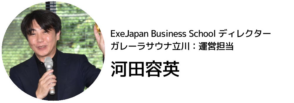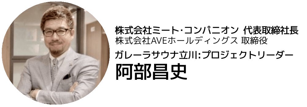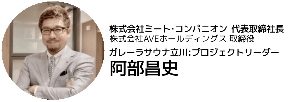 プロジェクトリーダーは阿部昌史(株式会社ミートコンパニオン代表取締役、株式会社AVEホールディングス取締役)、建築デザインを渡辺史門が担当し、併せて施設全体やプロダクトのデザインを監修。運営はエグゼジャパンビジネススクール・ディレクターの河田容英が担当。施設内の飲食セクションは新宿・立川・国分寺などで飲食店を展開する後藤信人(株式会社TRUSTY CORPORATION)。マッサージセクションは地元立川の経営者の小池俊則(株式会社ホットブレイン)が担当します。阿部昌史を中心としたプロジェクトメンバーはこのサウナ施設を、立川駅東北エリアのシンボル的な存在に育てて街の活性化に貢献したいと考えています。