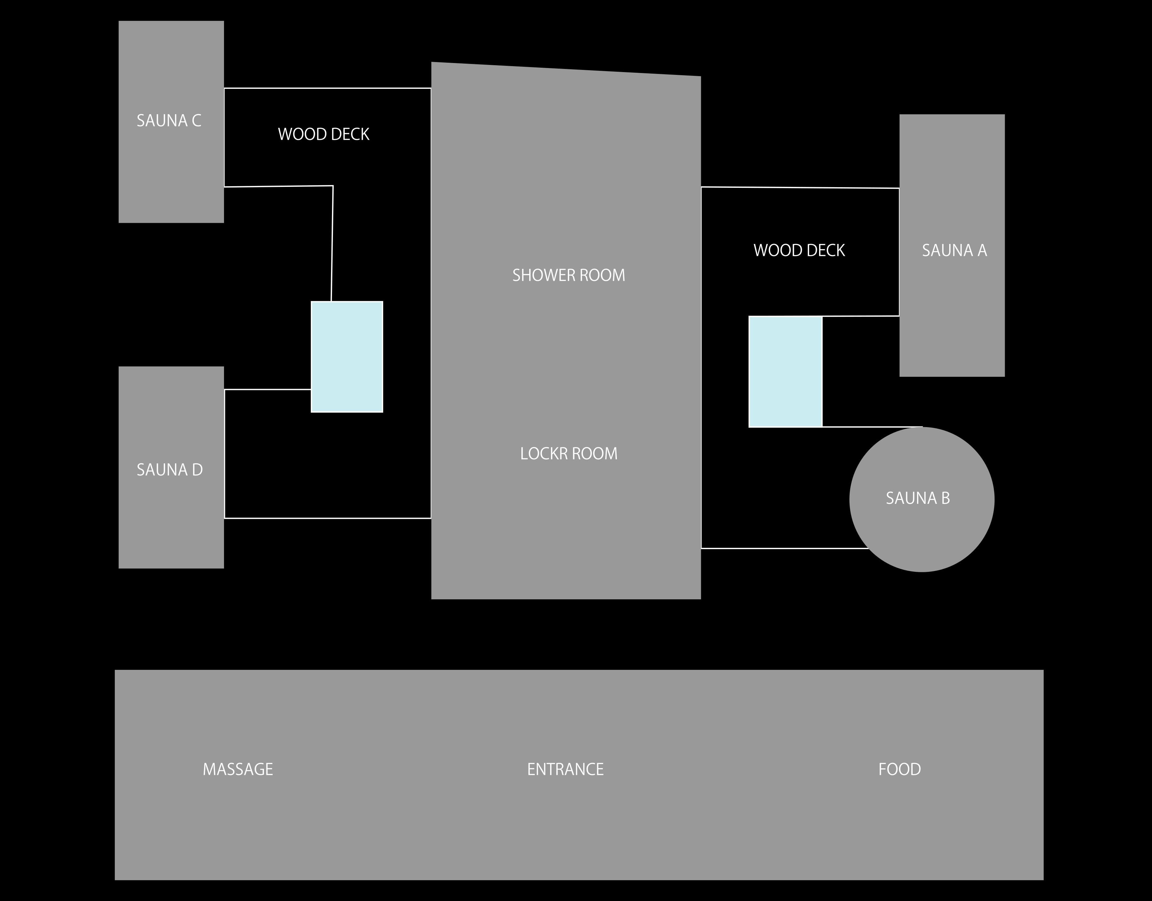 下図はサウナ敷地の全体像になります。4棟のサウナと本館、シャワー・ロッカー棟で構成されています。