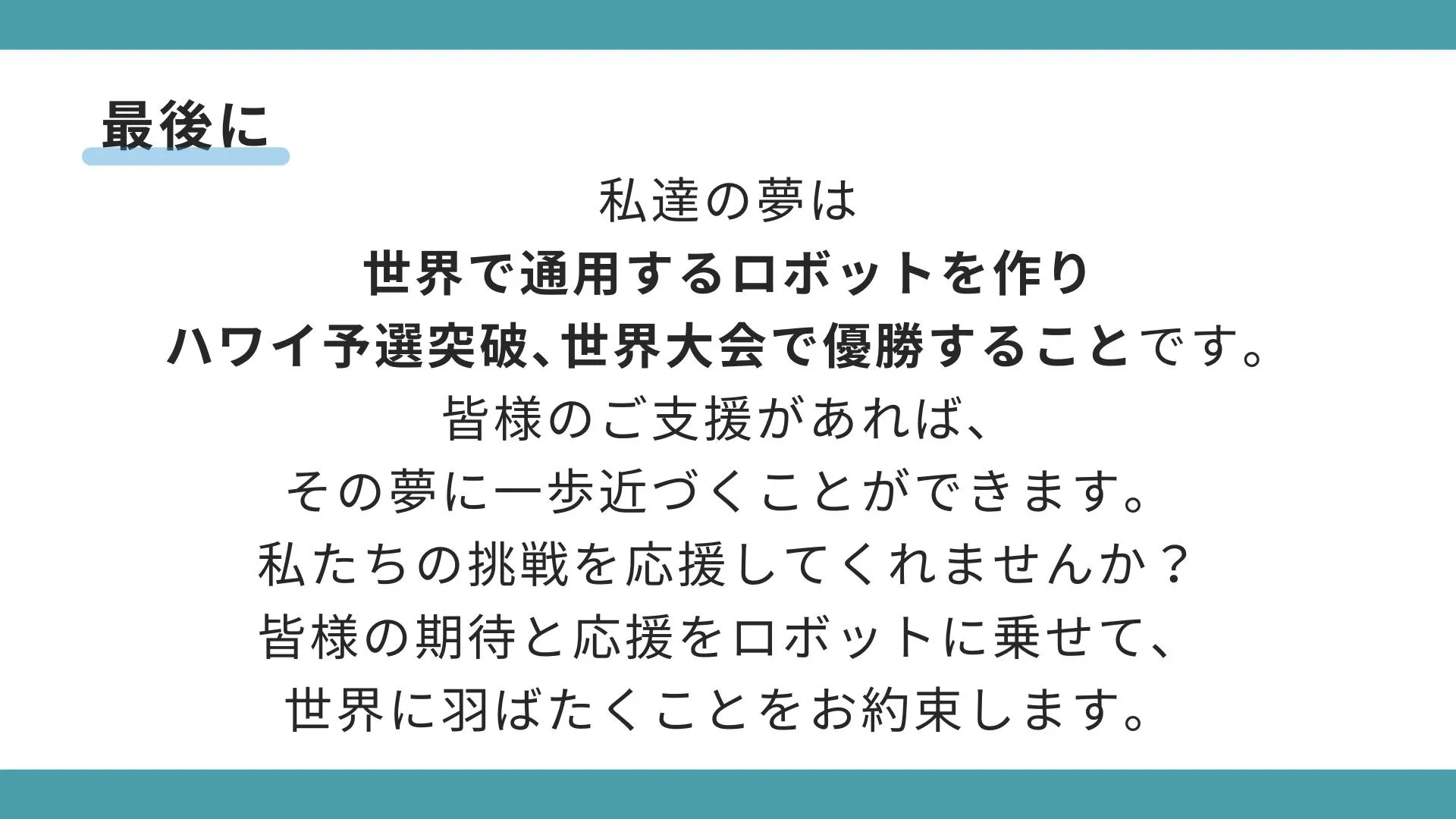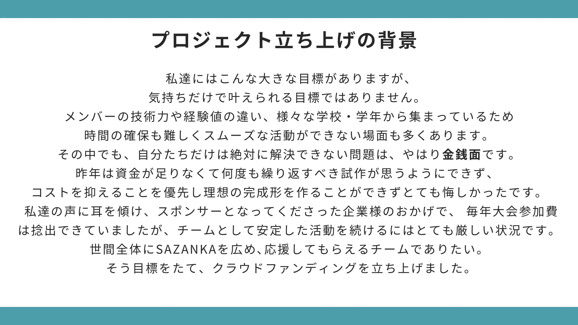 2024/10/14 11:23本日、プロジェクト文を更新させて頂きました!今までは文字ばかりで見にくかったものを、自分たちでスライドを作成し、より見やすく伝わりやすい、プロジェクト紹介を目指しました。まだまだ、たくさんのかたのご支援が必要な状況です!私たち中高生の熱意を感じ取っていただけた方、ご支援、拡散のほどよろしくお願いいたします! もっと見る