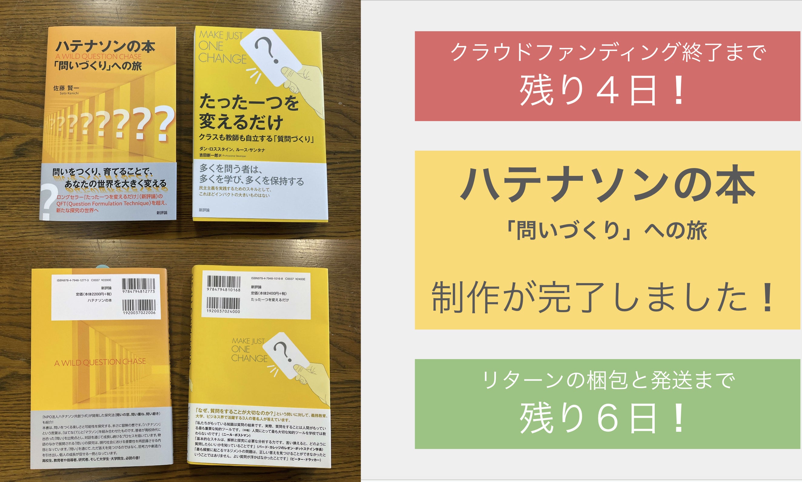 『ハテナソンの本:「問いづくり」への旅』の制作が完了し、本クラウドファンディング実施責任者の佐藤賢一のもとに届きました!