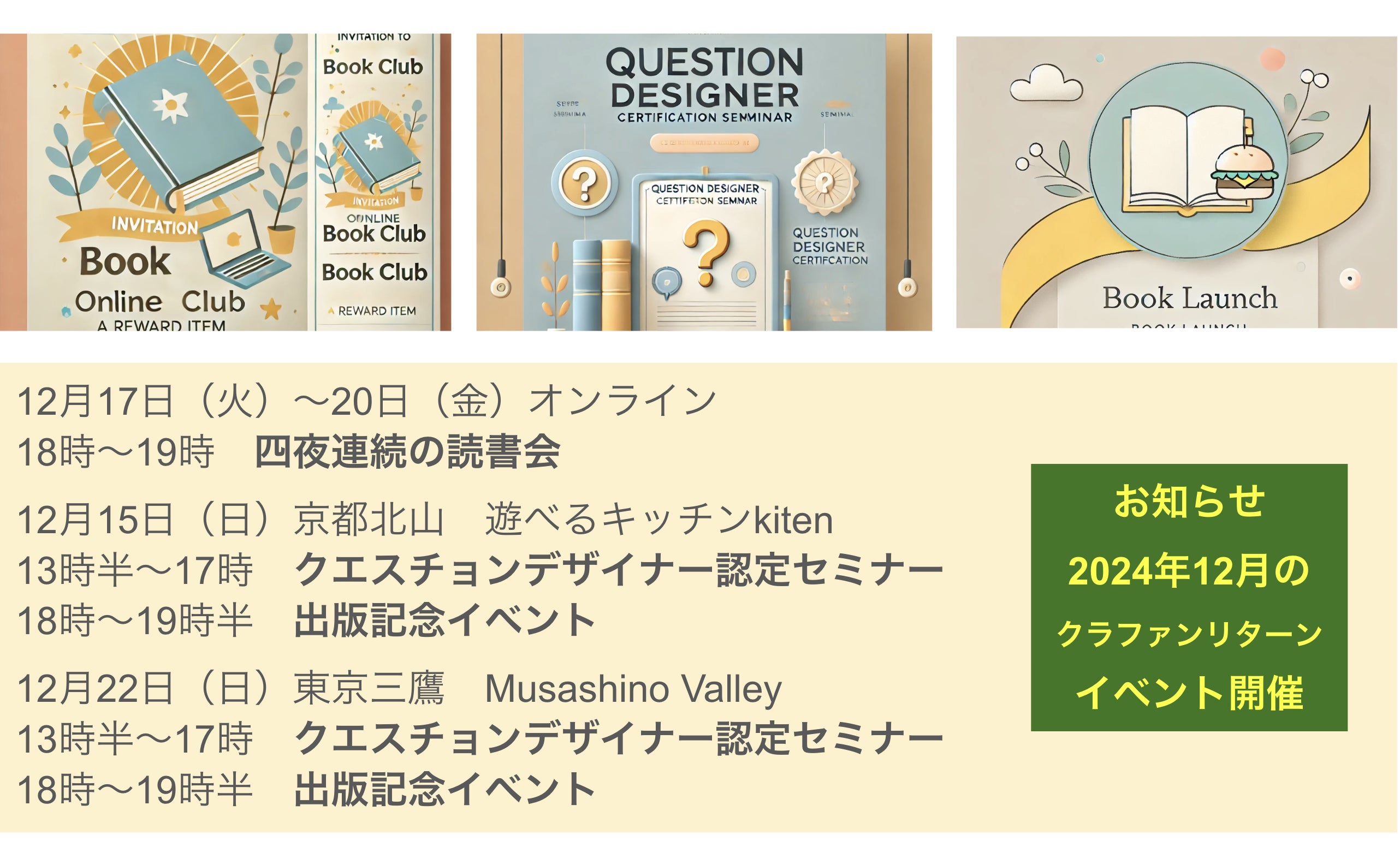問いづくりの旅を共に歩もう—『ハテナソンの本』クラファン終了&公式出版 直前 読書会実施目的 11月末頃に公式出版予定の『ハテナソンの本ー「問いづくり」への旅』の冒頭部(まえがき、もくじ、プロローグ)を読んでいただき、著者と、あるいは参加者同士で対話する機会と場を提供いたします。クラウドファンディングを応援してくださった支援者へ感謝の気持ちを伝えるとともに、まだの方には先行して本のエッセンスを体験してもらい、次のアクションをご検討いただくきっかけを提供する場となります。まだ実施時間と方法 13時30分〜16時30分:対面およびオンライン実施場所 MUSASHINO VALLEY(ムサシノバレー)〒181-0012 東京都三鷹市上連雀1丁目12-17 三鷹ビジネスパーク B1F、およびオンライン(Zoom)参加定員 オンライン形式:50名(Zoom形式:参加登録いただいた方には事前に設定情報をお知らせいたします)、対面形式:15名参加料 一般参加者:2,000円(キャンセルポリシー:イベント前日以降のキャンセルに対しては、返金いたしません。)クラウドファンディング【『ハテナソンの本ー「問いづくり」への旅』を出版したい!】支援者:無料参加申し込み方法:イベント告知サイトPeatixにてみなさんのご参加お待ちしております!ご案内役:佐藤 賢一お問い合わせ先:ハテナソン共創ラボ事務局メール:hatenathon.office<atto>gmail.com 注:<atto>はアットマークに置き換えてください。ホームページ:https://www.hatenathon.com/