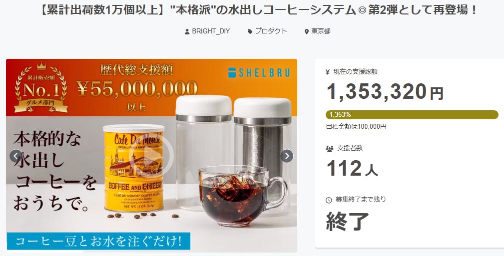 ご支援者様、【累計出荷数1万個以上】"本格派"の水出しコーヒーシステム◎第2弾として再登場!にご興味をお持ちいただきありがとうございます。プロジェクト開始から41日目で112人ものご支援者の方々より支援頂き、無事プロジェクト終了を迎えることが出来ました。早速皆様のリターンを2025年02月末にお届けできるよう準備を始めております!皆様にご満足いただけるリターンをお届けできるよう、全力で取り組んで参りますので引き続き、「【累計出荷数1万個以上】"本格派"の水出しコーヒーシステム◎第2弾として再登場!」をよろしくお願い致します。BRIGHTチーム