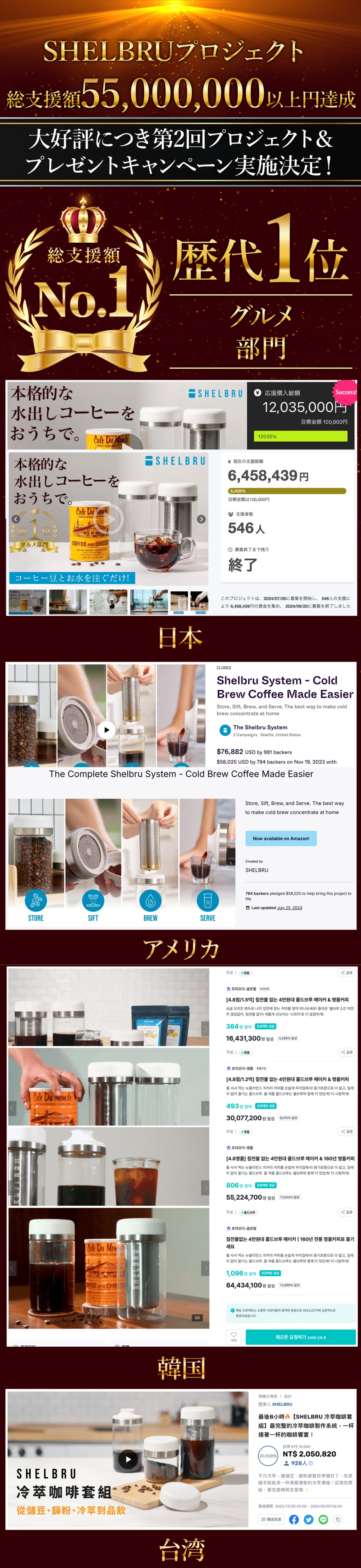 SHELBRUのCOLD BREW SYSTEM PROは簡単に美味しいコーヒーが作れる優れもの。皆様のコーヒーとの生活がより楽しくなるよう、私たちは製品を絶えず企画し、開発しています。より多様なコーヒー抽出ツール、グラインダーなど様々な製品をこれからも製作する予定です。