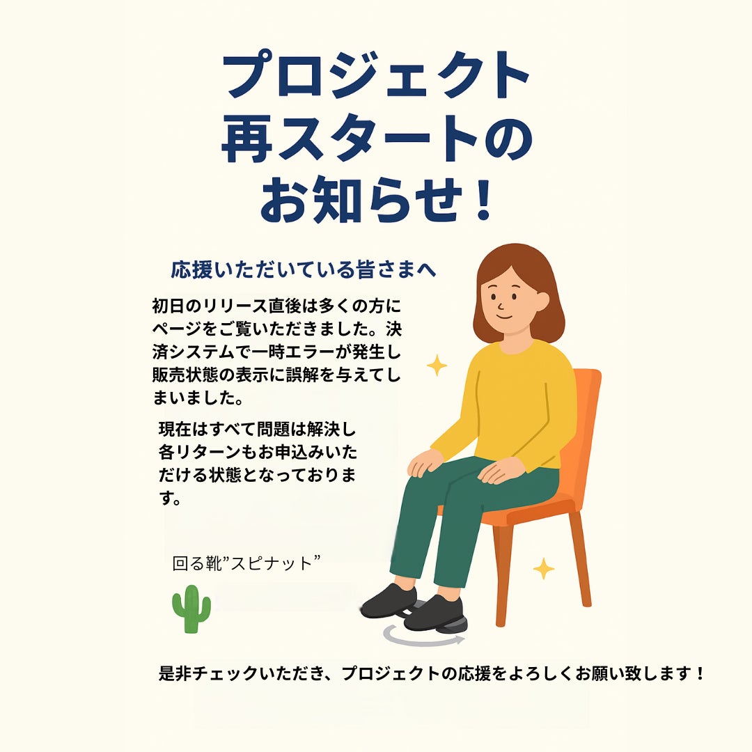 2025/09/04 22:20応援いただいている皆さまへ初日のアクセスでは多くの方にページをご覧いただきましたが、決済の反映がシステム上で一時的に遅れてしまい、販売状況の表示に誤解を与えてしまいました。現在はすべて通常通り、各リターンをお申し込みいただける状態になっております。また、多くの方から「気になっていたのに売り切れていた」という声をいただき、ご要望にお応えして【数量限定・超早割リターン】を再設定いたしました!「回る靴スピナット」 仕事や勉強の合間に、ながら運動ができる新しい体験です。ぜひチェックいただき、プロジェクトの応援をよろしくお願いいたします! もっと見る