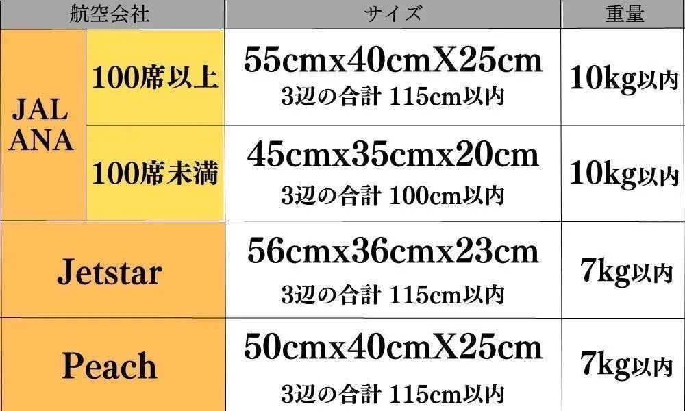 但し、航空会社・路線・特別な事情によって異なる場合があるため、事前に各航空会社の機内持ち込みのサイズをご確認ください。