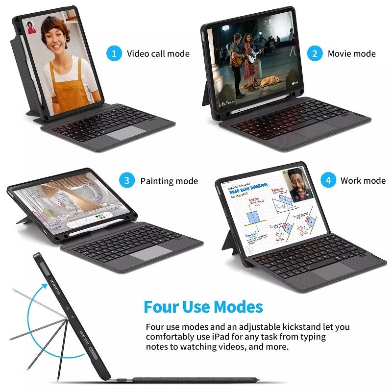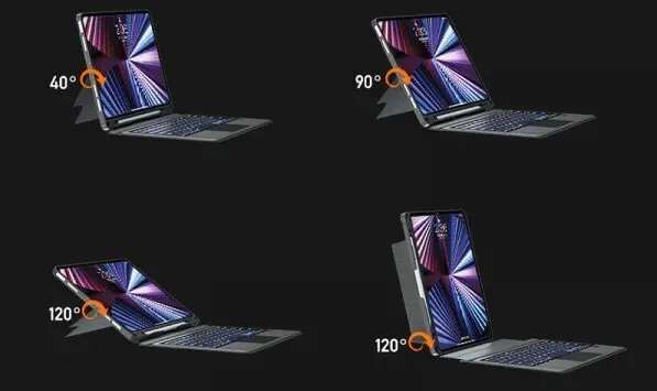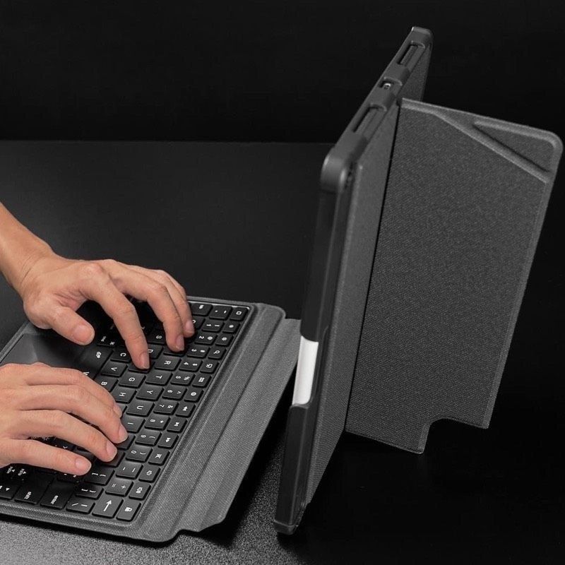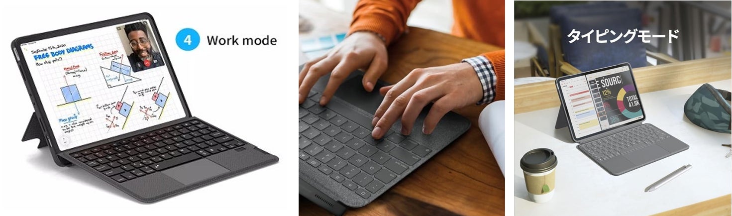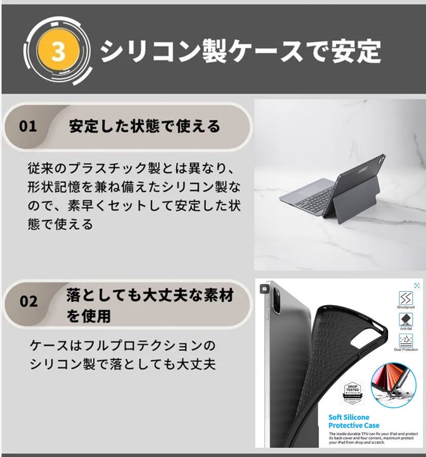 👆柔軟なキックスタンドは、0〜180°のマルチアングル傾斜を提供します。形状記憶がある高品質シリコン素材を採用し、0〜180°の間をどの角度でもしっかりとiPadを支えます。