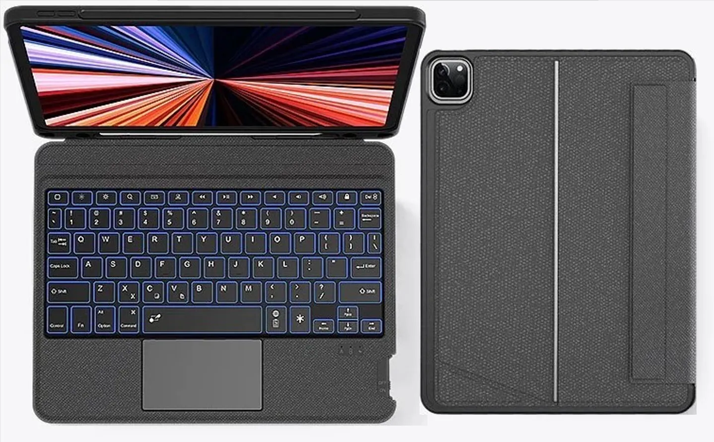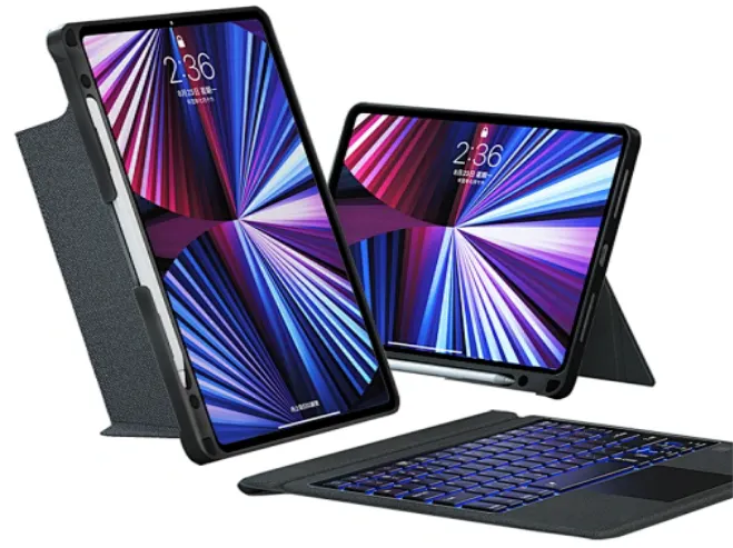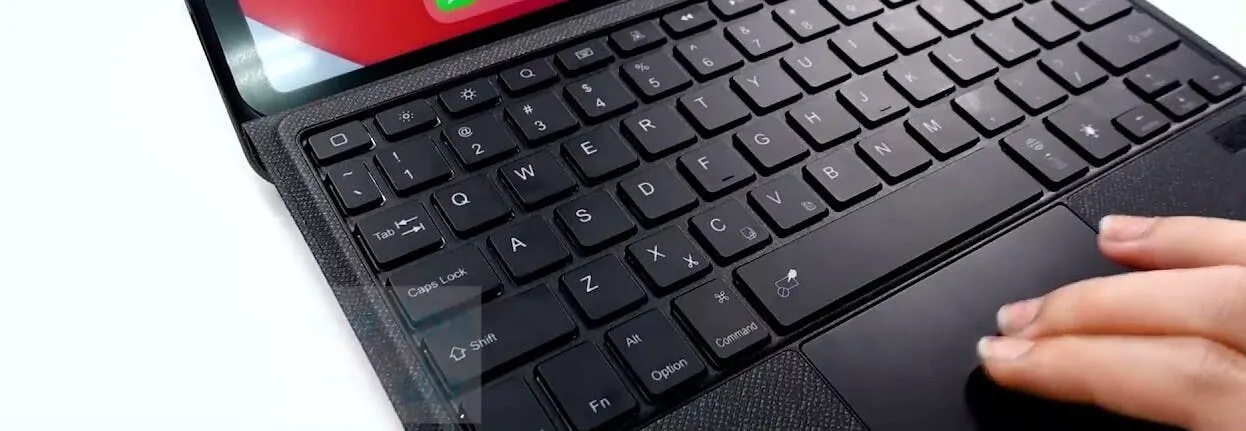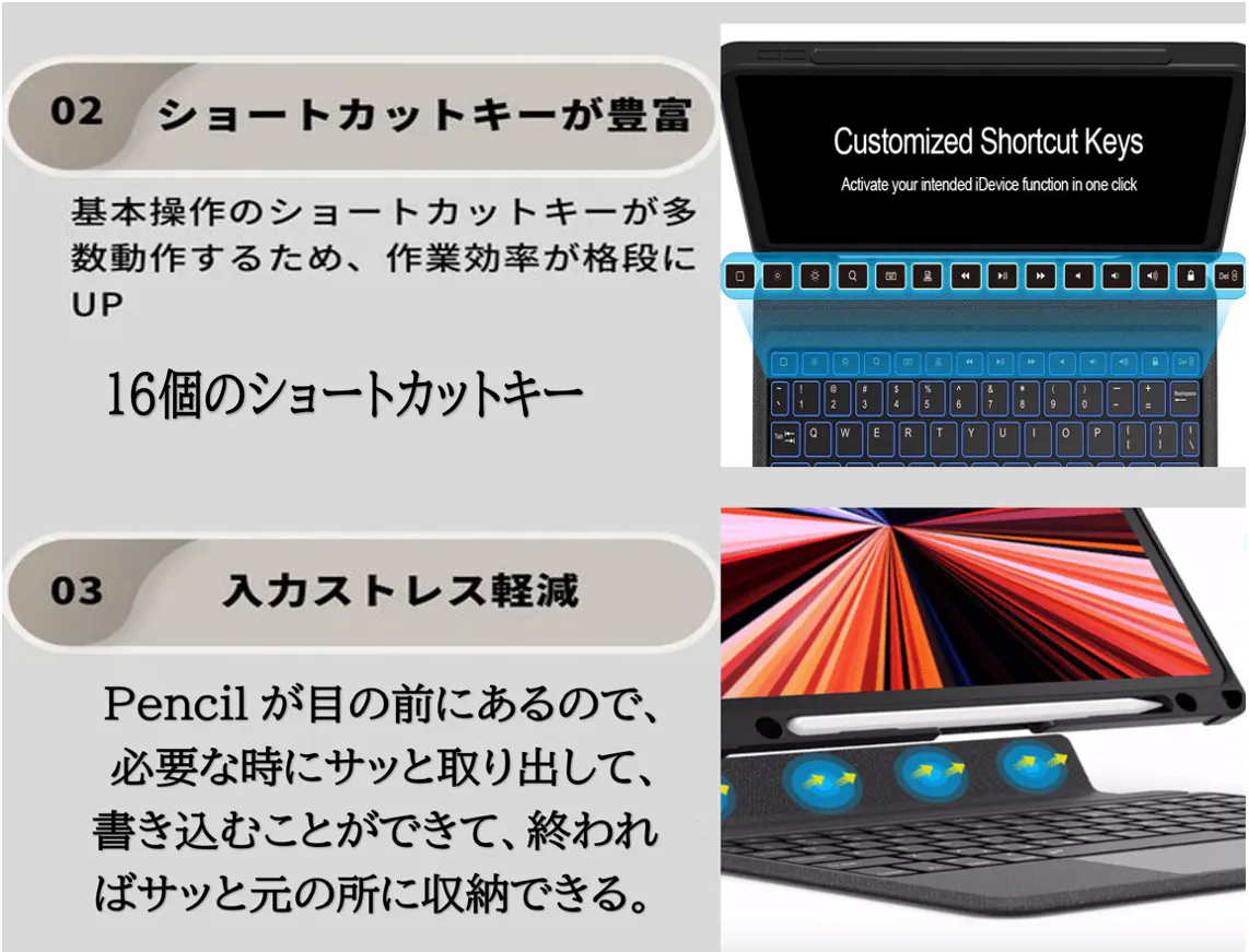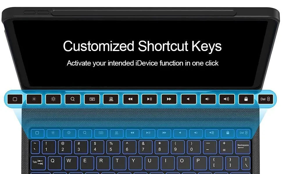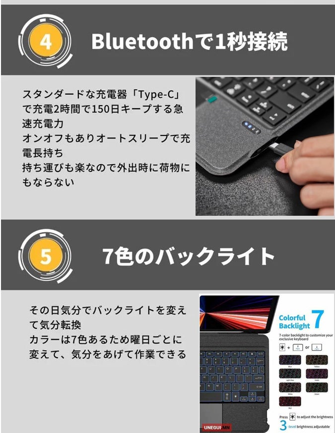 7色のバックライト - iPadOSショートカットのフル列と7色のRGB LEDバックライト: 青、緑、赤、シアン、紫、黄色、白。ライトキー+上/下矢印を押して色を切り替えます。屋内、屋外、夜間の使用に合わせて3段階の明るさ調整をサポートします。ライトキーを押して明るさを調整します。