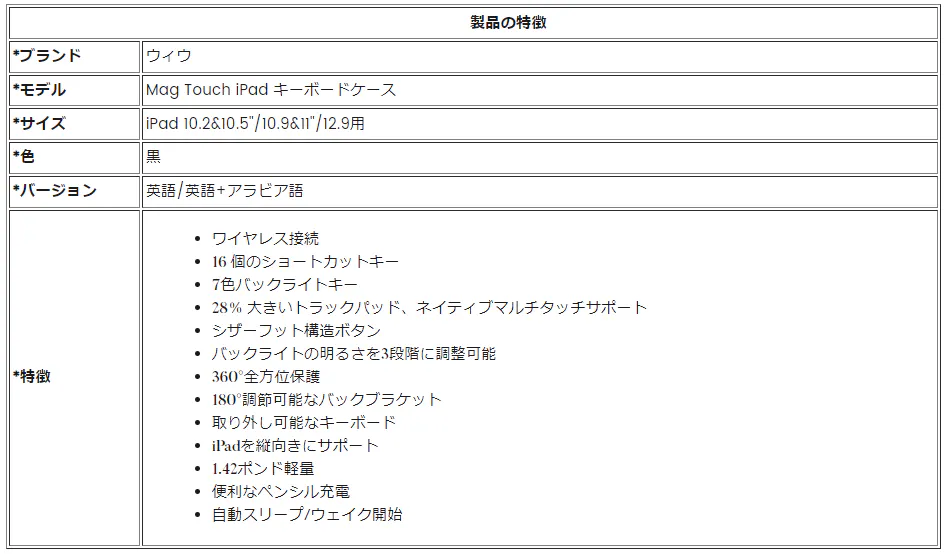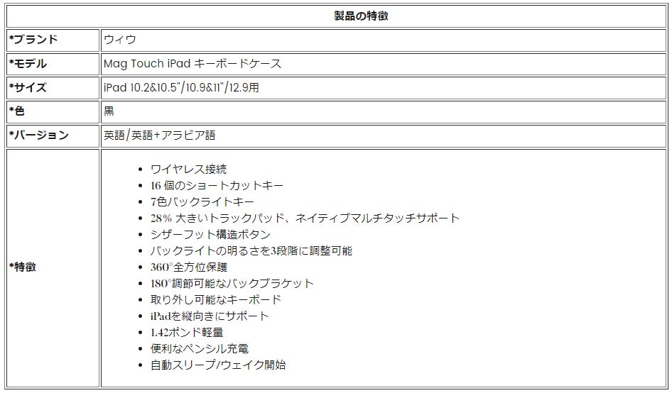長いスタンバイ時間 - キーボードの動作時間は80時間、スタンバイ時間は150日間持続し、充電には2〜3時間しかかかりません。キーボードケースを開閉すると、バッテリー寿命を節約するために自動スリープ/ウェイクが開始されます。キーボードを 10 分間放置すると iPad は自動的に切断され、キーボードの任意のキーを押してウェイクアップできます。