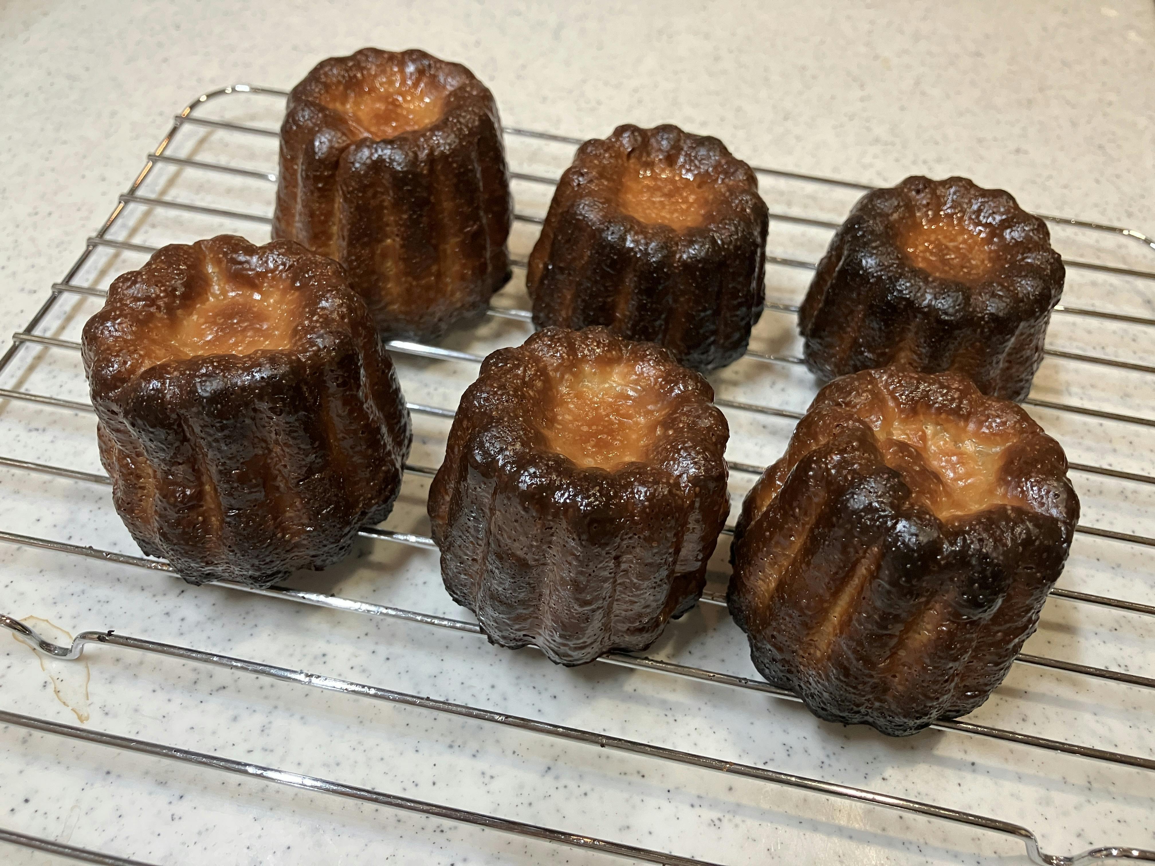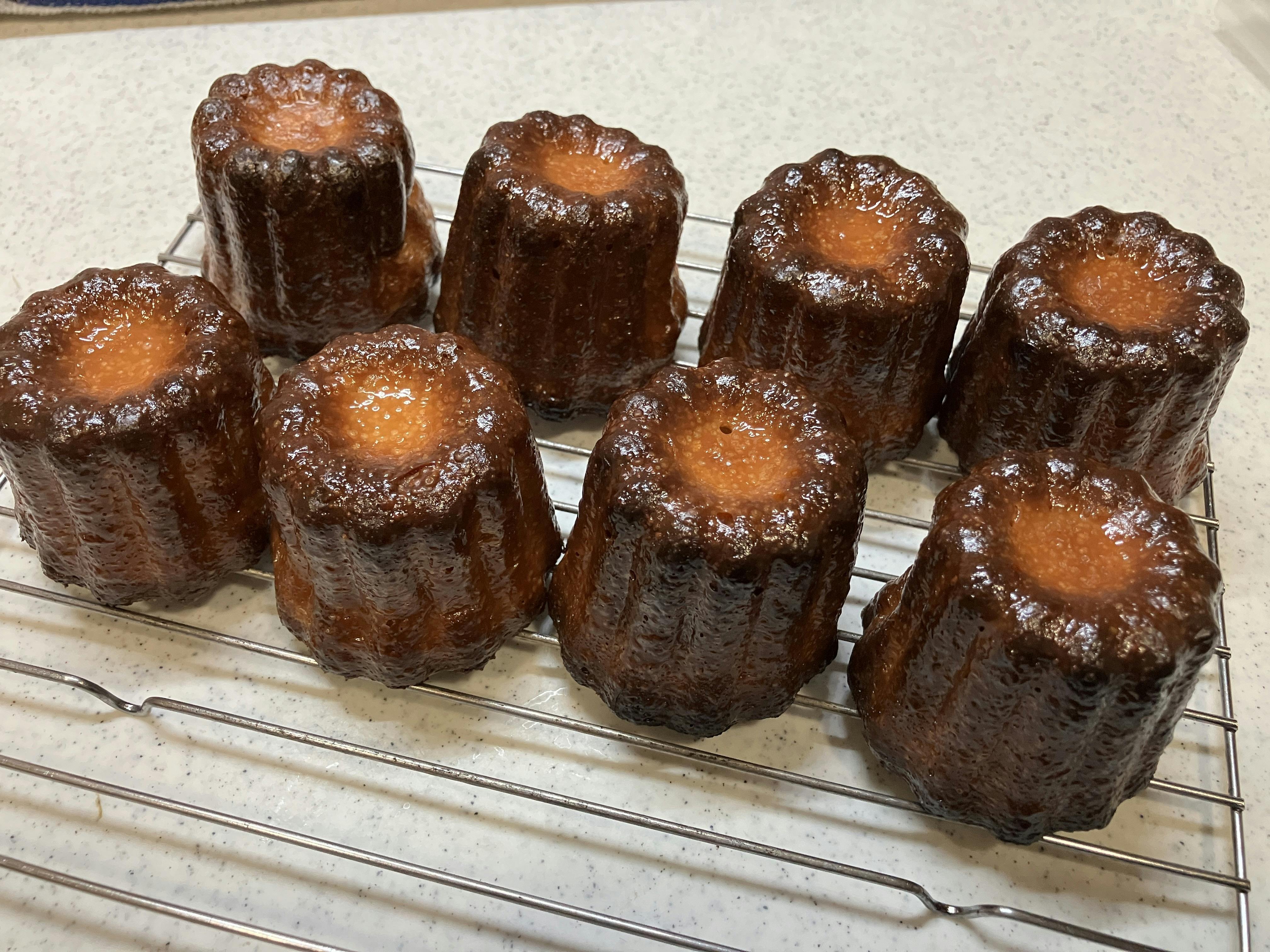 2024/10/01 22:00日曜日にカヌレを焼いてみました。レシピでは鉄板型を使っていましたが、シリコン型で焼いたのも有りレシピ通りの焼き時間では表面は良い焼き色でしたが、型に接していた部分はまだまだ黄色くいかにも焼足らない状態でした。なので、型から抜いた状態でもう一度焼足しました。少し潰れましたが食感も味もなかなかの物でした。焼型やオーブンの癖をつかんでレシピを調整すればリターンの商品にも十分できると少し自信を持ちました!!あと少しお待ちください。 もっと見る