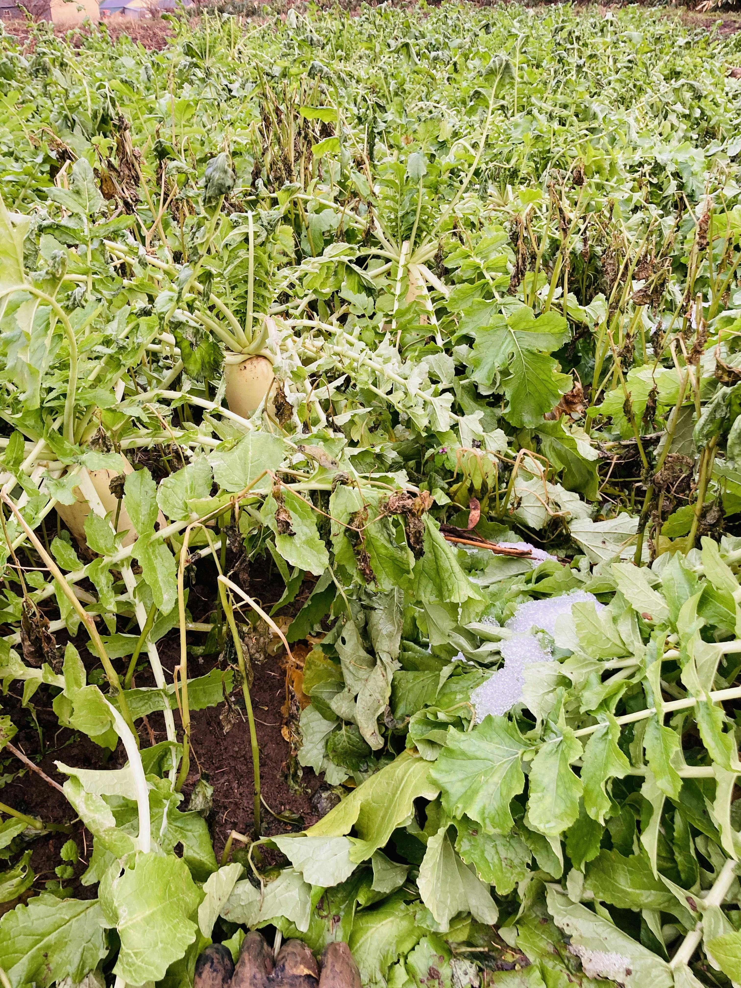 畑は冷たい空気がピリッと気持ちよく。そして、土の中で待ち構えているのは立派な大根たち!