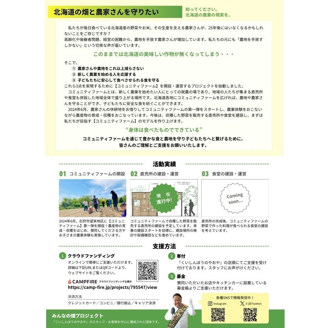 こんにちは!【みんなの畑プロジェクト】代表の齊藤です。いつも私たちの活動を応援してくださり、本当にありがとうございます!先日、とても温かい出来事がありました。クラウドファンディングのページを見て、「操作が難しくて…」とお店まで直接寄付を持ってきてくださった方がいらっしゃいました。その方は、プロジェクトの想いをしっかり受け取ってくださっていて、「こどもたちの食を守りたい」「農家さんや畑を応援したい」というお気持ちを直接伝えてくださったのです。こうした皆さまからのご支援が、私たちの原動力です。心から感謝しています。寄付という形での応援も受け付けています。これまでも何人かの方から「お店で直接寄付をしたい」というお声をいただいてきました。その理由は、・クラウドファンディングの操作が難しい・直接顔を見て応援の気持ちを伝えたいといったものです。もちろん、クラウドファンディングを通じての支援もとてもありがたいのですが、「直接応援したい」というお気持ちも、とても嬉しく思っています。そこで、もし「お店で直接寄付したい」と考えてくださる方がいらっしゃいましたら、どうぞお気軽にお声がけください。『くいしんぼうのやおや』店頭にて、寄付を受け付けています。プロジェクトへの想いや進捗など、ぜひお話しさせてください。プロジェクトの成功は、支援してくださる皆さん一人ひとりのお力添えがあってこそです。直接の寄付に限らず、応援の言葉や拡散など、どんな形でも私たちの活動を支えてくださることに心から感謝しています。北海道の畑や農家さんを守るため、そして子どもたちに安心して食べられる北海道の豊かな食を紡ぐため、どうかこれからも応援をお願いいたします。