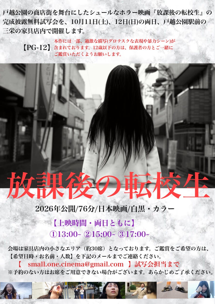 2025/09/14 18:00引き続き、こちらはチラシの裏側になります。 もっと見る『放課後の転校生』無料試写会のご報告(チラシ表面)