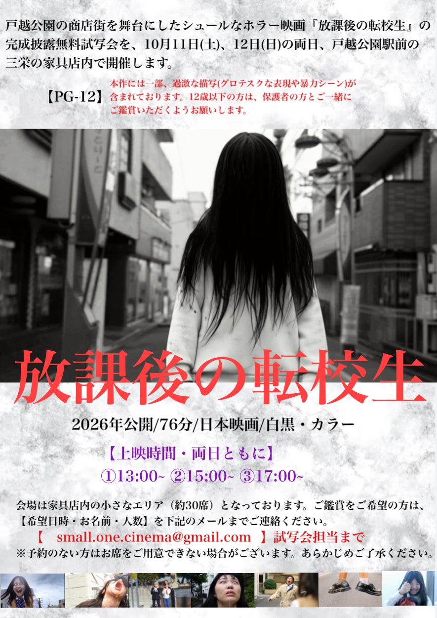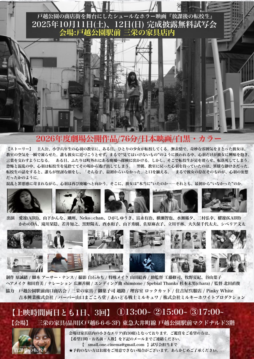 映画『放課後の転校生』にご支援くださった皆さまへこのたび、映画『放課後の転校生』(76分)が、皆さまのご支援のおかげでようやく完成いたしました。心より御礼申し上げます。早速ではございますが、来月10月11日(土)・12日(日)の両日、制作拠点となった戸越公園駅前の【三栄の家具】店内にて、無料試写会を開催いたします。本来であれば近隣の上映施設を利用したかったのですが、いずれも商店街から離れており、本作の舞台である戸越公園商店街でどうしてもお披露目したいという思いから、今回は家具店の店舗内にて試写会を実施する運びとなりました。各日ともに、以下の3回上映を予定しております:【①13:00~ ②15:00~ ③17:00~】会場は家具店内の一角(約30席)となっております。ご鑑賞をご希望の方は、【希望日時・お名前・人数】を下記メールアドレスまでご連絡ください。 small.one.cinema@gmail.com (試写会担当まで)※予約のない方にはお席をご用意できない場合がございます。あらかじめご了承ください。なお、今回の試写会にご参加いただけない方には、後日映画をご視聴いただけるURLをお送りする予定です。今後とも、どうぞよろしくお願いいたします。令和7年9月14日合同会社adg-ethics【エーディージーエシックス】 代表・北田直俊http://www.adg-theater.com/adg/