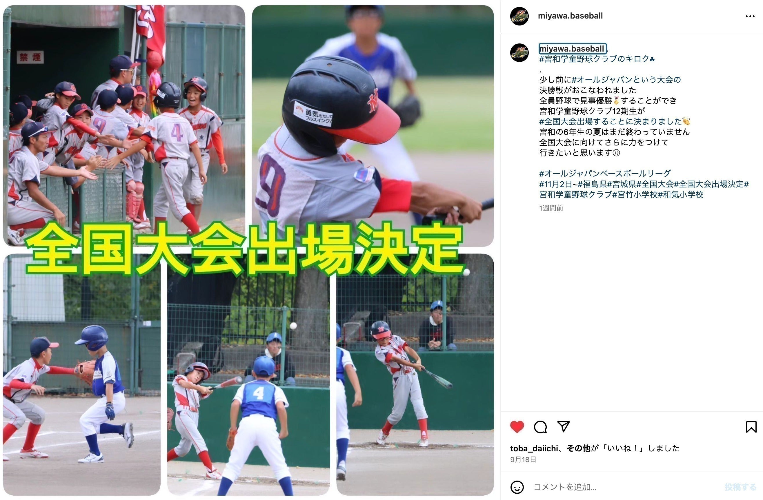 このたび、私たち宮和学童野球クラブは、2024年11月2日から4日に福島県と宮城県で開催される「オールジャパンベースボールリーグ小等部2024全国大会」への出場が決定いたしました!初めての全国大会という大きな舞台に挑むことができることを大変誇りに思います。