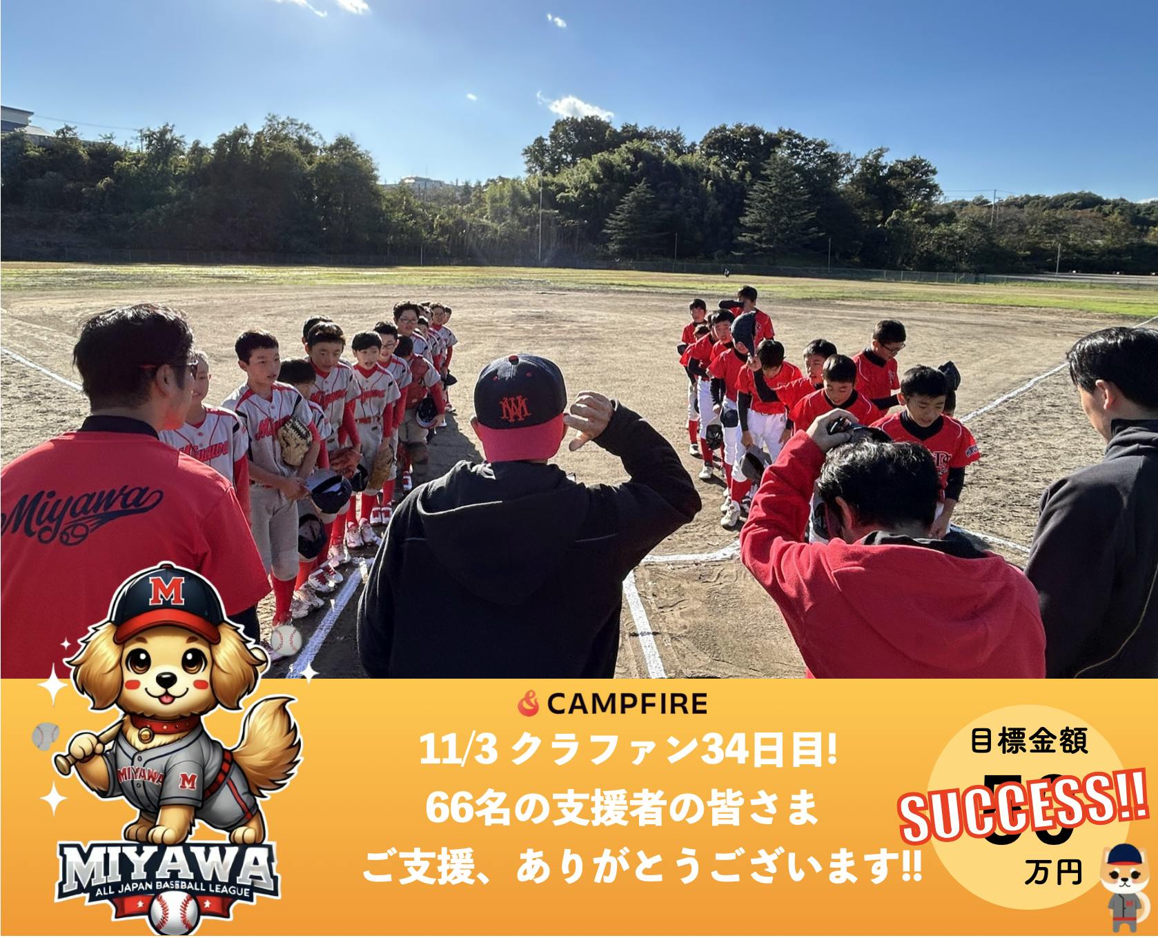 2024/11/04 00:20全国大会現地からの2日目のご報告!全国大会もいよいよ二日目を迎えました!昨日の熱戦に続き、本日も選手たちは全力で交流試合に臨んでいます。天候にも恵まれ、青空の下でプレーする子どもたちの姿には、感動とともに誇りを感じずにはいられません。本日は、同じクラウドファンディングに挑戦している府中・ドンキィーズ(広島県代表)さんとの奇跡的な交流戦が実現しました(^_^)試合結果は2-4で惜しくも敗れましたが、素晴らしい強豪チームと対戦できたことは、子どもたちにとって大変貴重な経験となり、互いに成長を感じるひとときとなりました。試合後、府中・ドンキィーズさんと一緒に記念撮影を行い、父兄同士でも子どもたちを支える思いや、支援活動の苦労や喜びについて語り合い、楽しい時間を過ごせたことに、改めて心からの感謝を感じています。お見送りもして頂きました(^_^)皆さまのご支援のおかげで、こうして素晴らしい経験ができていることに深く感謝いたします。全国大会を通じて成長していく子どもたちの姿を、これからもお届けできるよう精一杯頑張りますので、引き続き応援をよろしくお願いいたします!---全国大会で完成した、ラッキボーイ(選手&父兄バージョン)です!! もっと見る