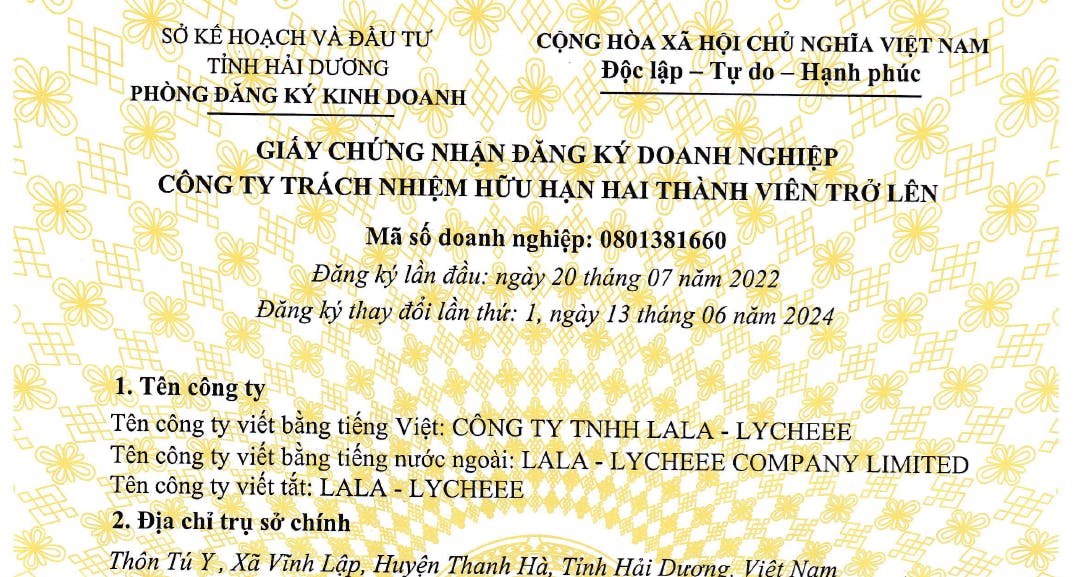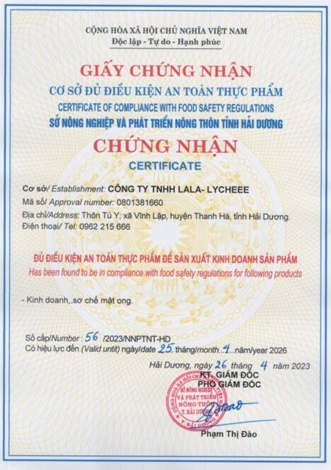 この会社は、夫ニャンの地元フィンラップ(Vinh Lap村)で栽培しているライチのはちみつを使った食用・飲料品の製造と販売をしている正規の事業者です。