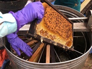 そして、蜜蓋を取り除いた巣枠を遠心分離機に入れて回し、はちみつを集めます。