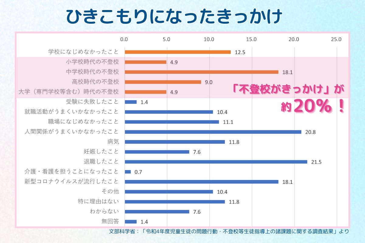 不登校がきっかけでその後、長期にわたり引きこもりになるケースもあり、内閣府の調査でも、引きこもりの約20%が、不登校がきっかけと回答しています。