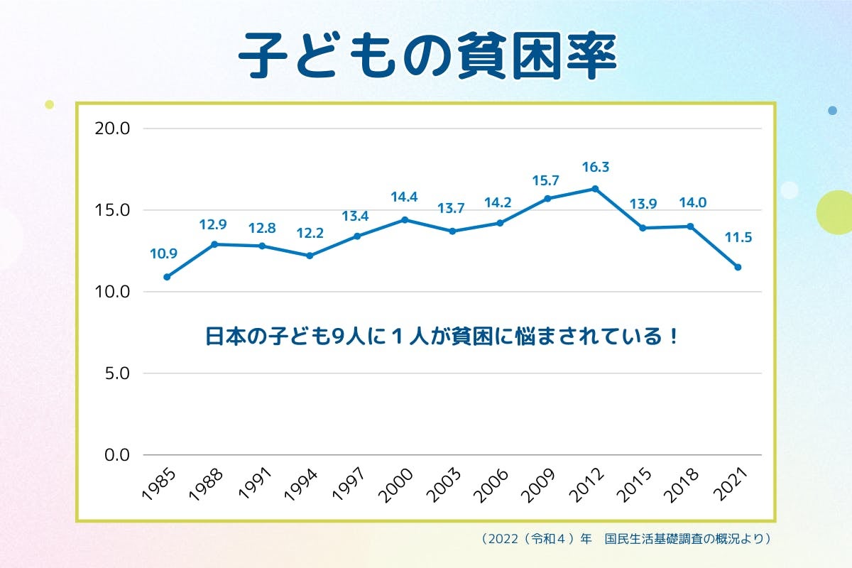 生まれ育った家庭やさまざまな事情から生活環境が制御される中、親に頼ることもできず毎日を一生懸命に生きている子どもや若者がいます。2023年に厚生労働省が公表したデータでは、日本の子どもの貧困率は11.5%と9人に1人が貧困の状態にあることが報告されています。