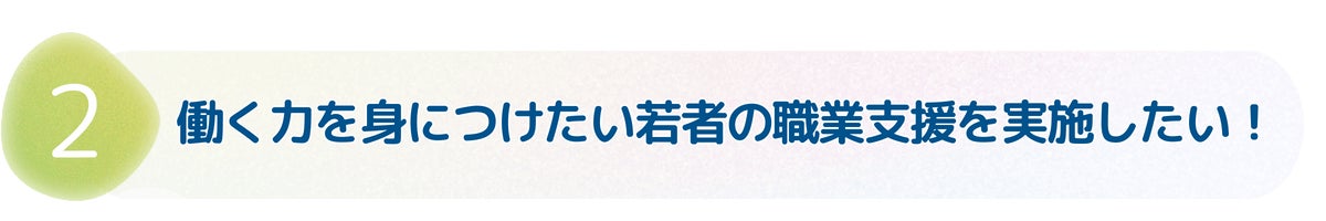 働き方がわからない、人とどうコミュニケーションをとったら良いのかわからない、就職したくても一歩を踏み出すキッカケが得られず悩んでいる若者に対し、わたしたちは職業支援を通じ、ひとりでは解決することの難しい状況に寄り添い、就労できる状態になるまでサポートします。