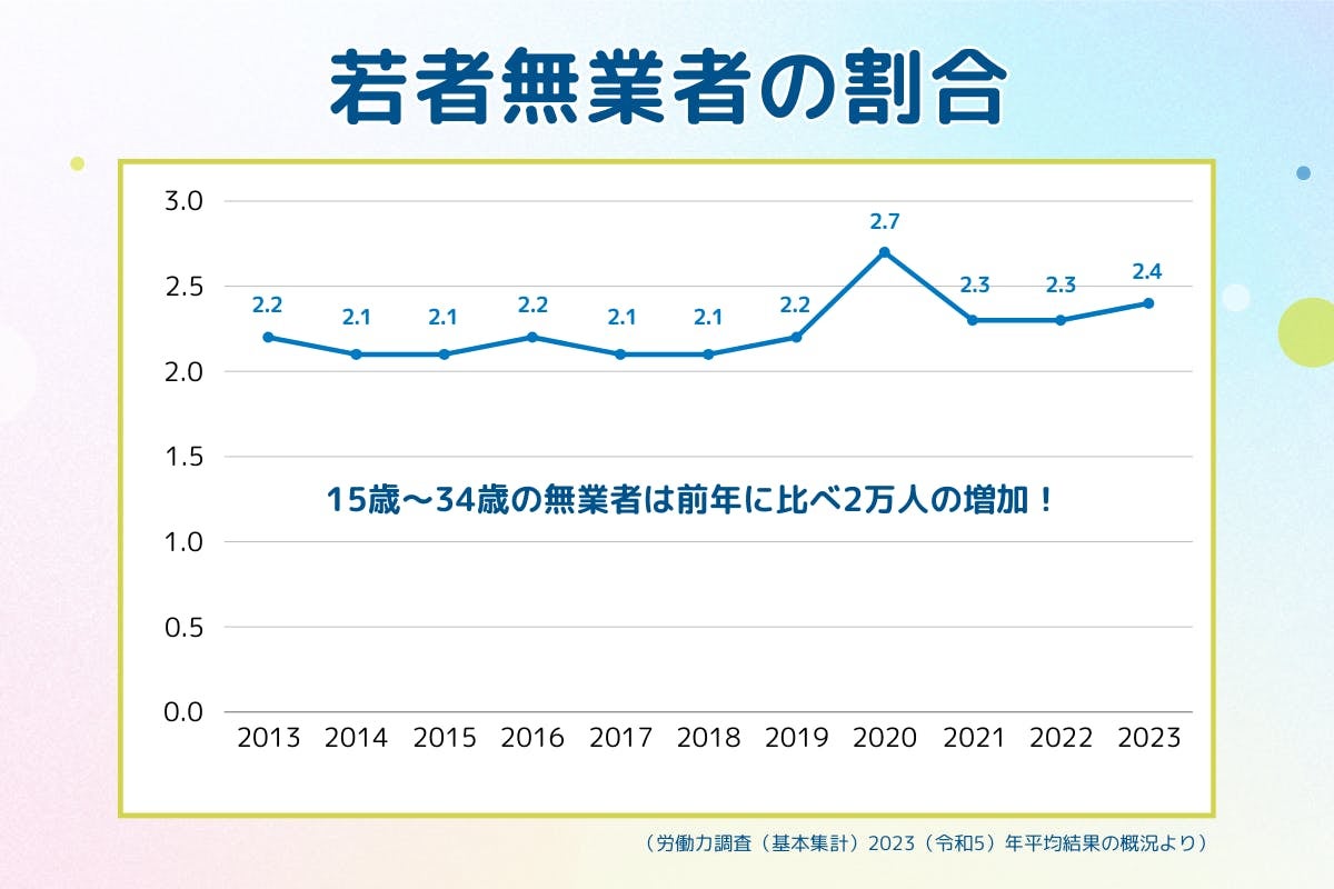 家庭環境や経済状況だけではなく、さまざまな社会的要因から職につけず無業者となっている若者の割合が増加している日本。2023年に総務省統計局が公表したデータでは、若年無業者数(15歳~34歳)が2022年と比べて2万人の増加となっていることが報告されています。