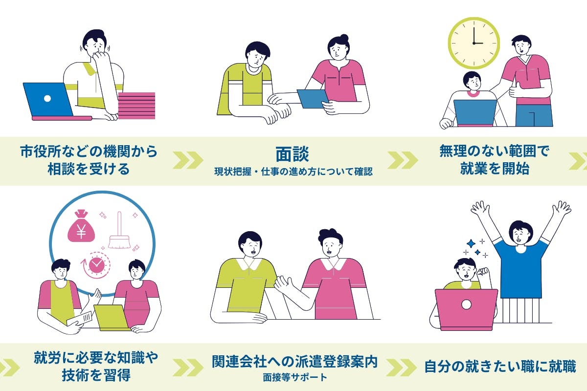 ❺問題なく就業できるようになったら、就きたい職業につけるよう関連会社への派遣登録や面接のサポート