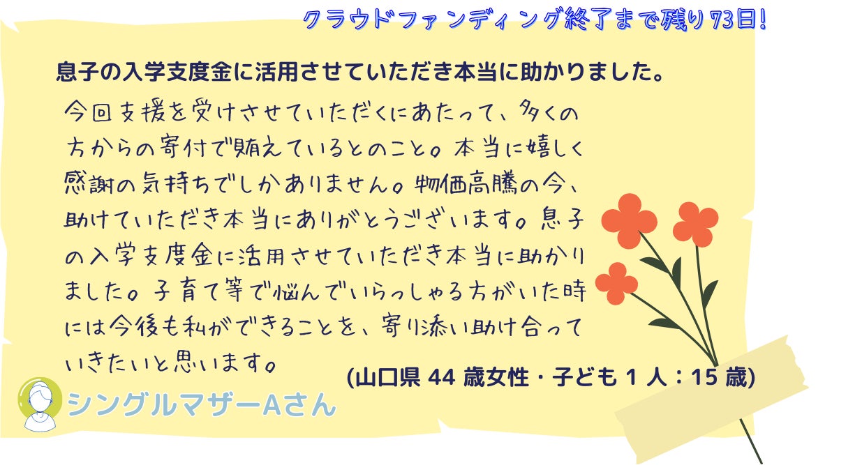 私たちは、様々な理由により収入が著しく減少してしまったひとり親家庭への支援を行っています!実際に支援金を受け取られた方よりお礼のお言葉をいただきました!