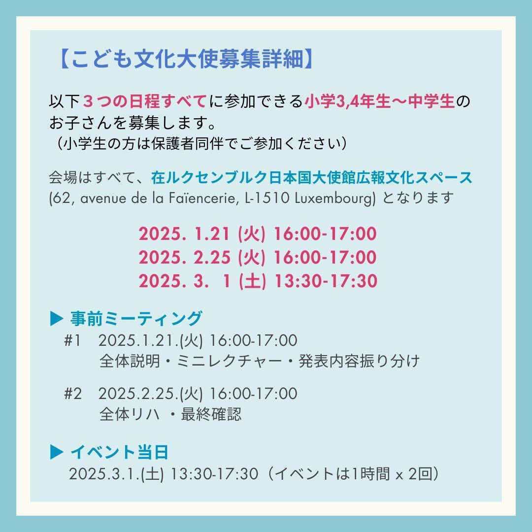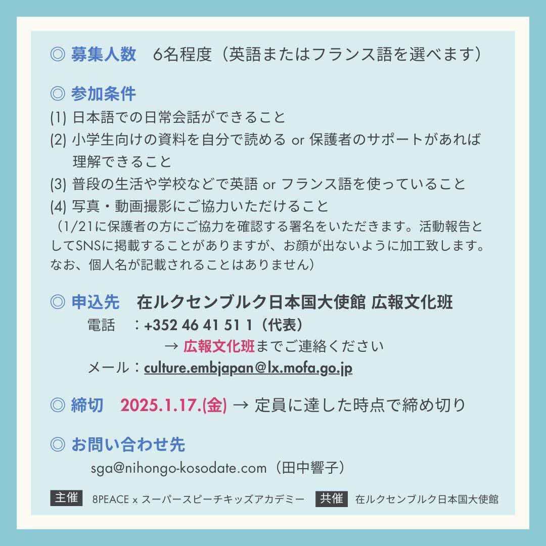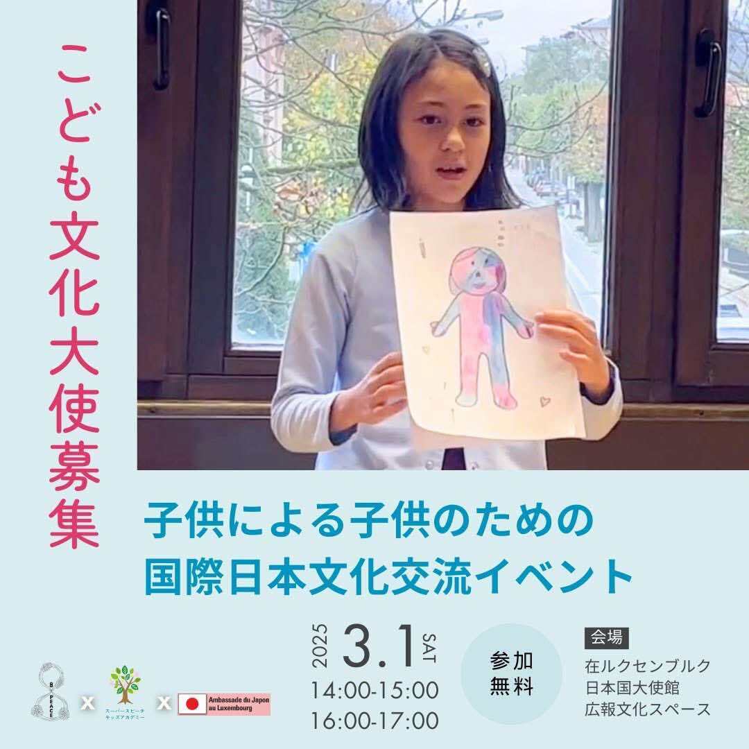 現在、ルクセンブルクにおいて教育・子育ての観点から国際交流を促進する活動を実施しているスーパースピーチキッズアカデミーと在ルクセンブルク日本国大使館の協力を得て、子供文化大使を1月17日まで募集しています。