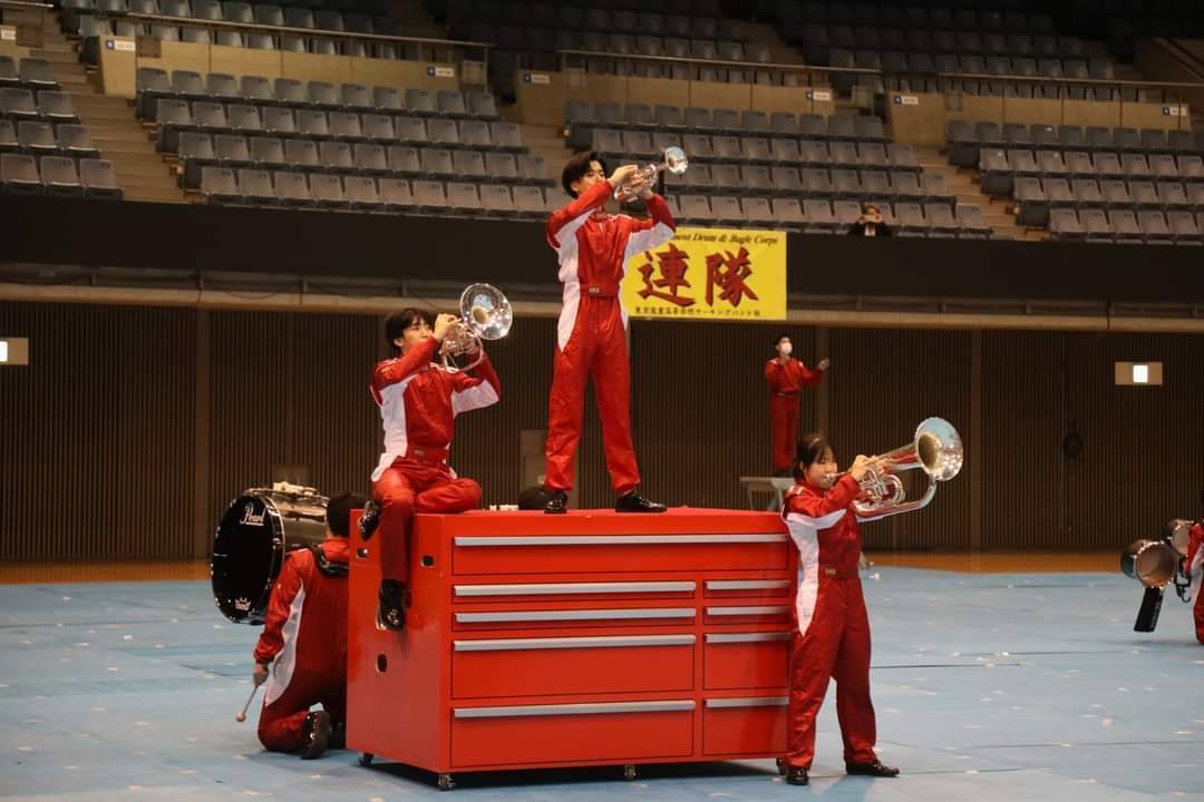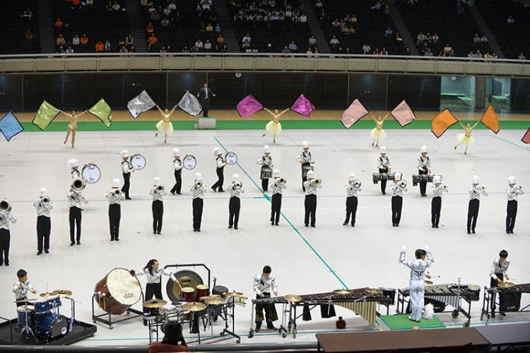 マーチングバンドは近年テレビ等でも紹介されるようになりましたが、隊列を組んで行進しながら演奏・演技を行うパレードの他にも、一つのショーテーマをもって30m×30mという広いフロアを使いフォーメーションで動きながら、演奏・演技を行う競技大会もあります。