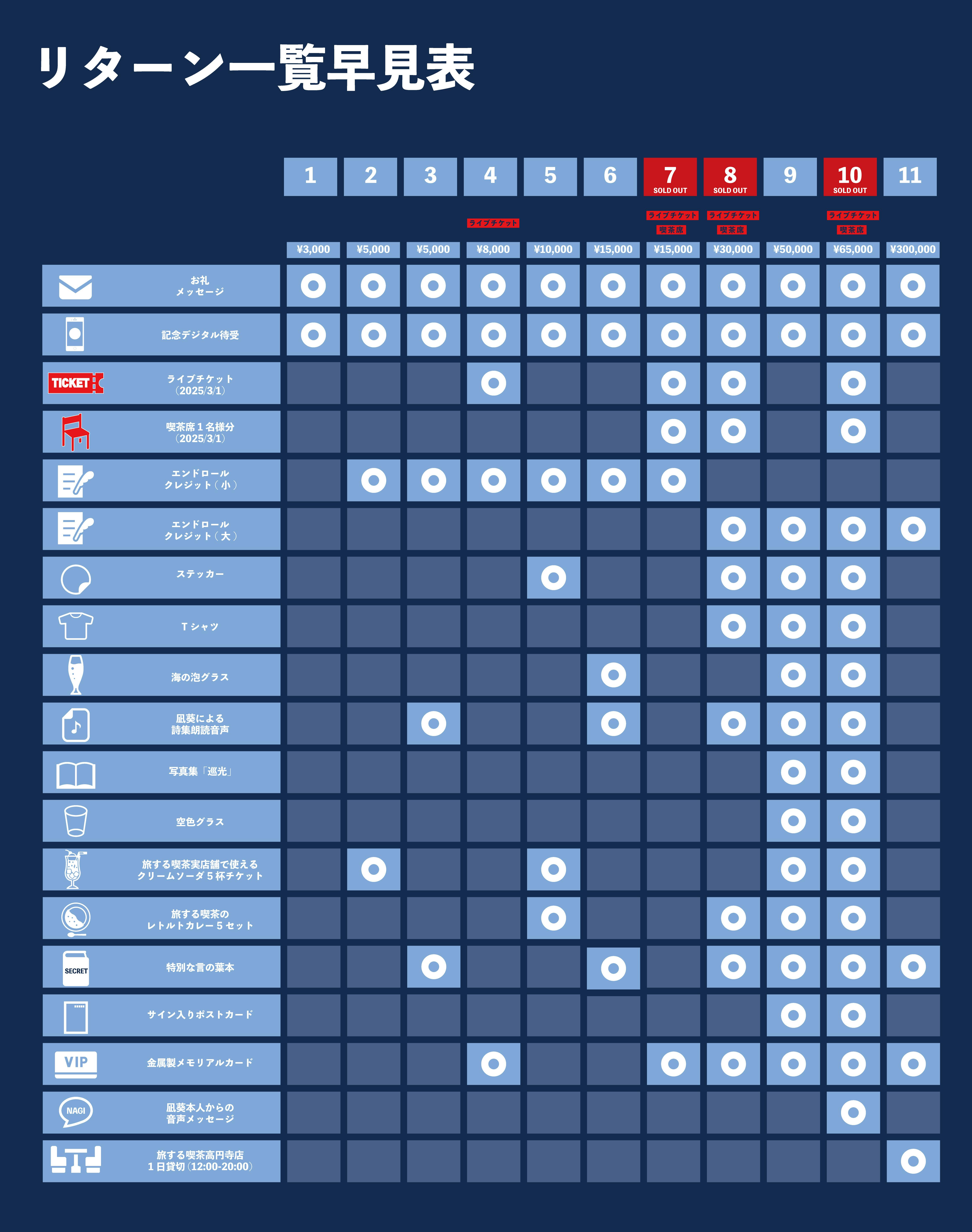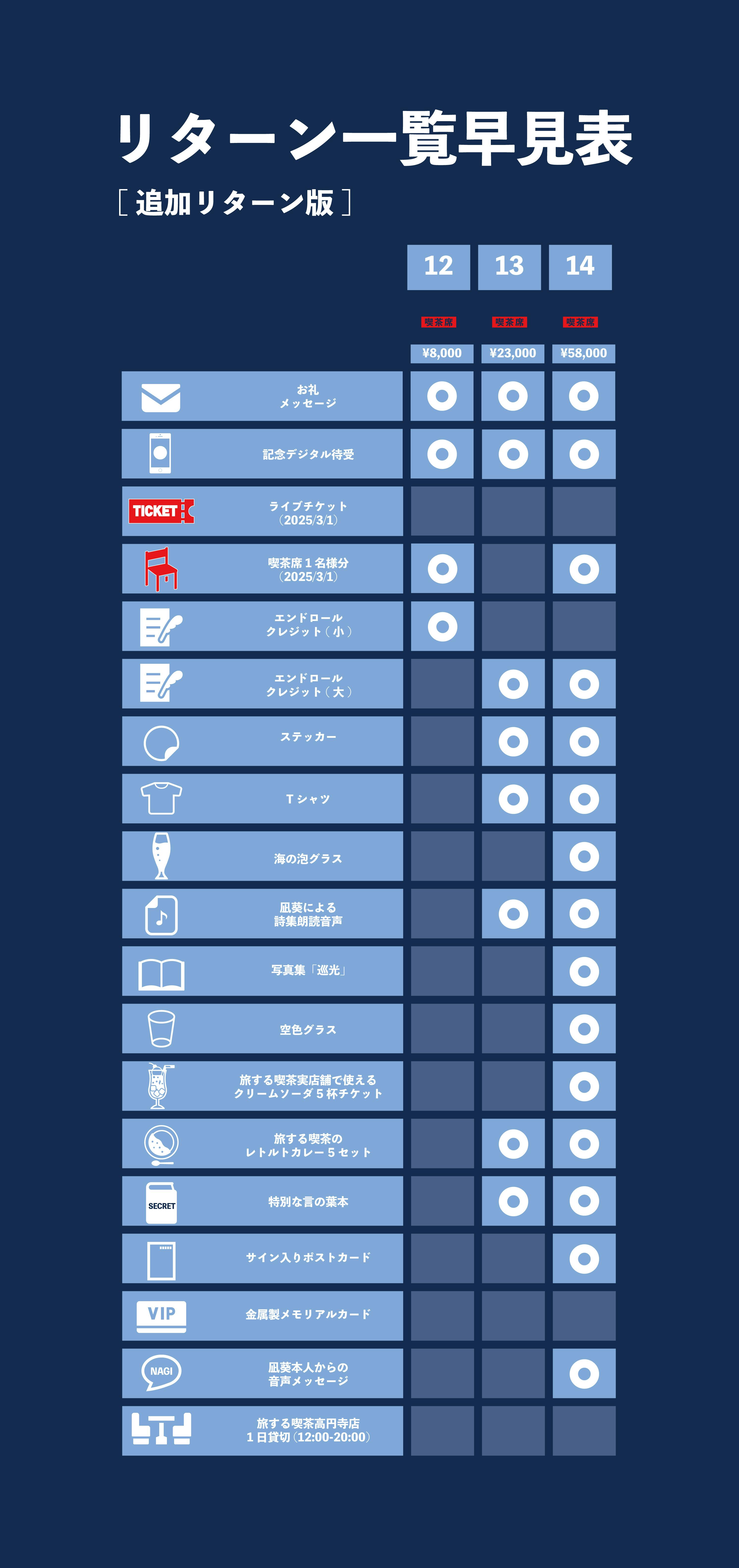 A:下記を予定しております。今回のクラファンでは3/1のライブチケット、喫茶席のみのご案内となります。