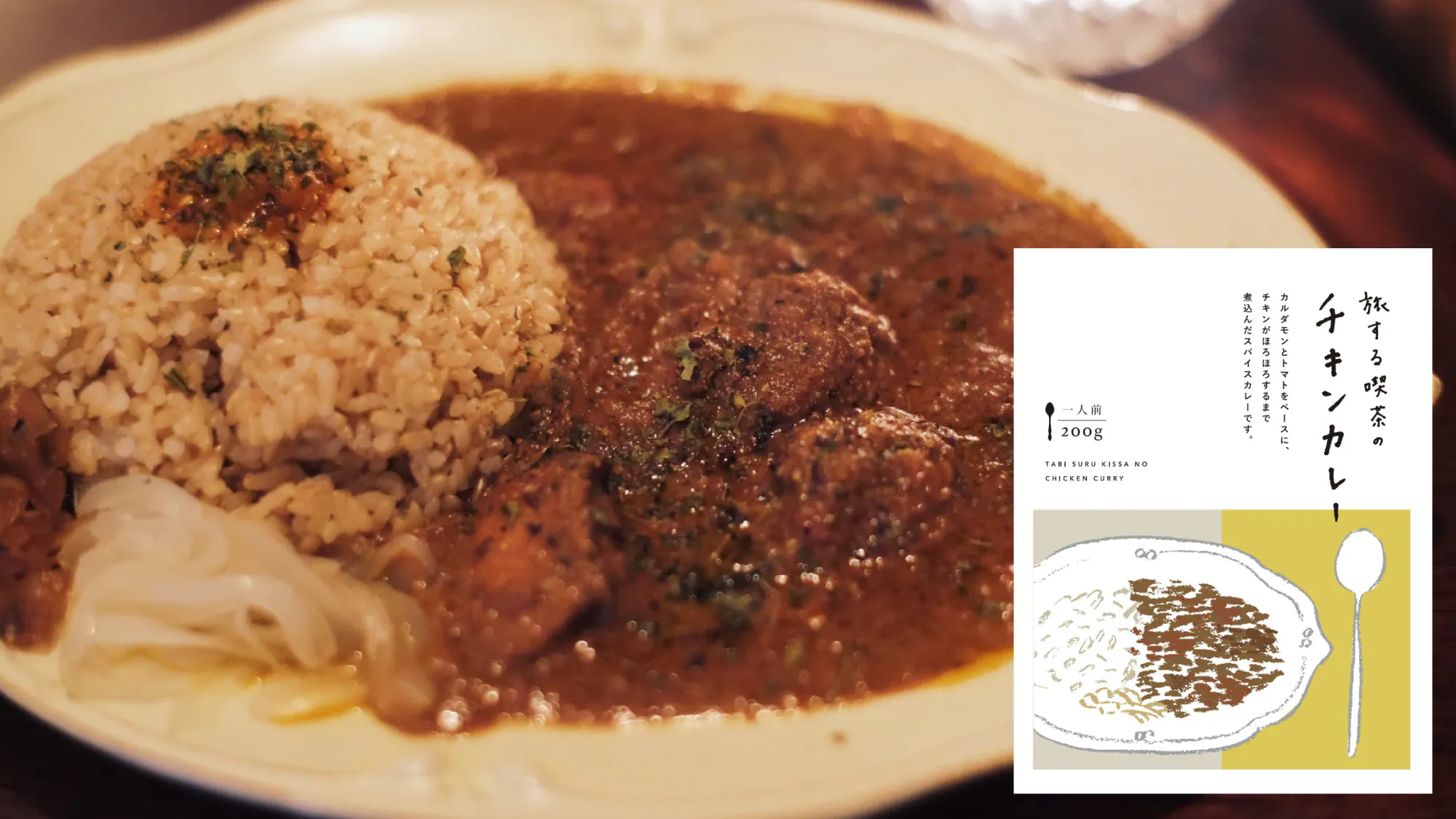 旅する喫茶の定番メニュー「チキンカレー」をお家でも楽しんでもらいたくて、レトルトパックを作りました。こちらを全国の皆さまの元へお届けさせていただきます。