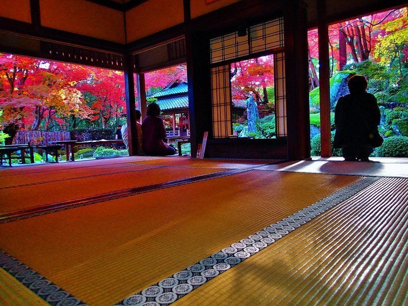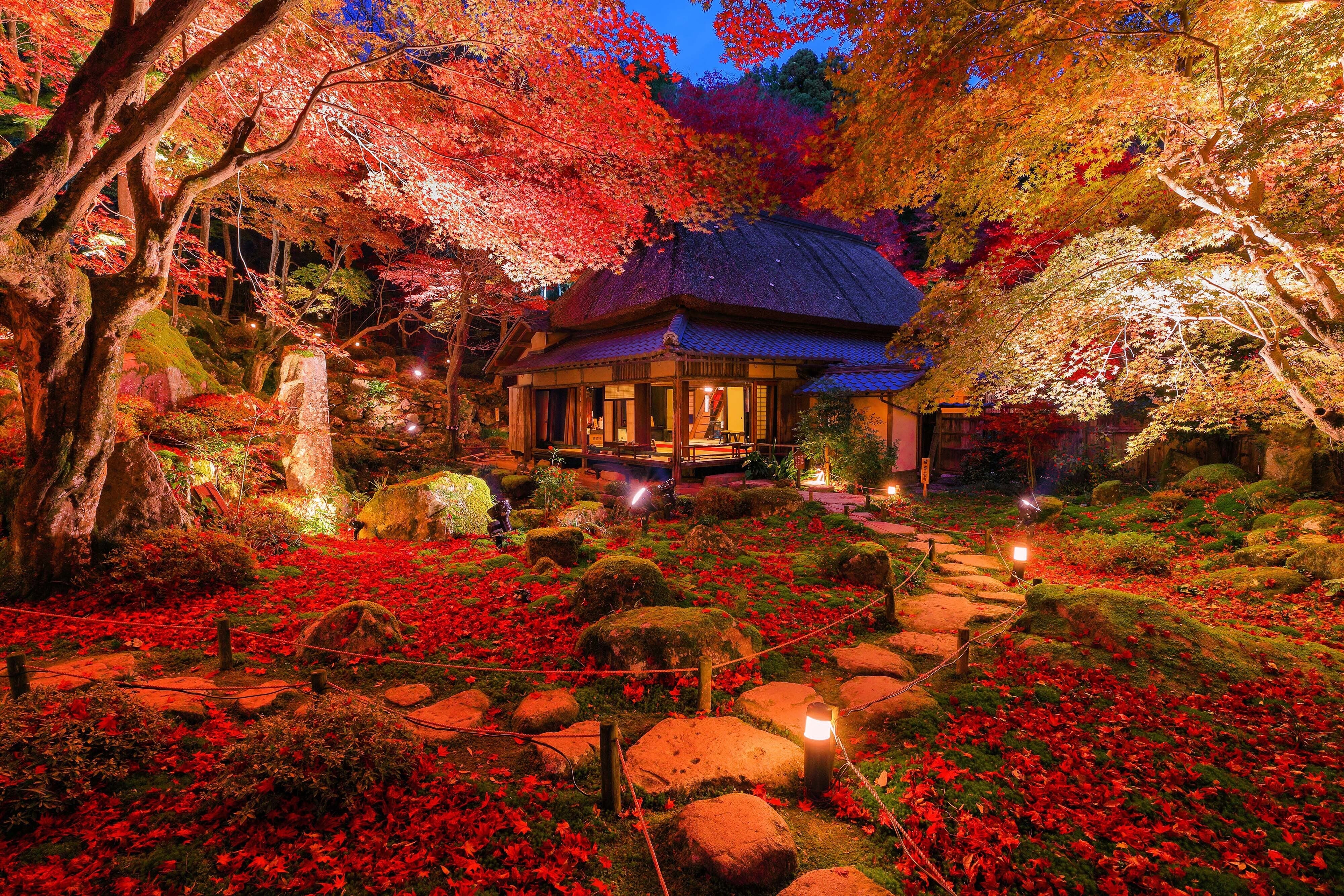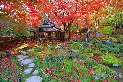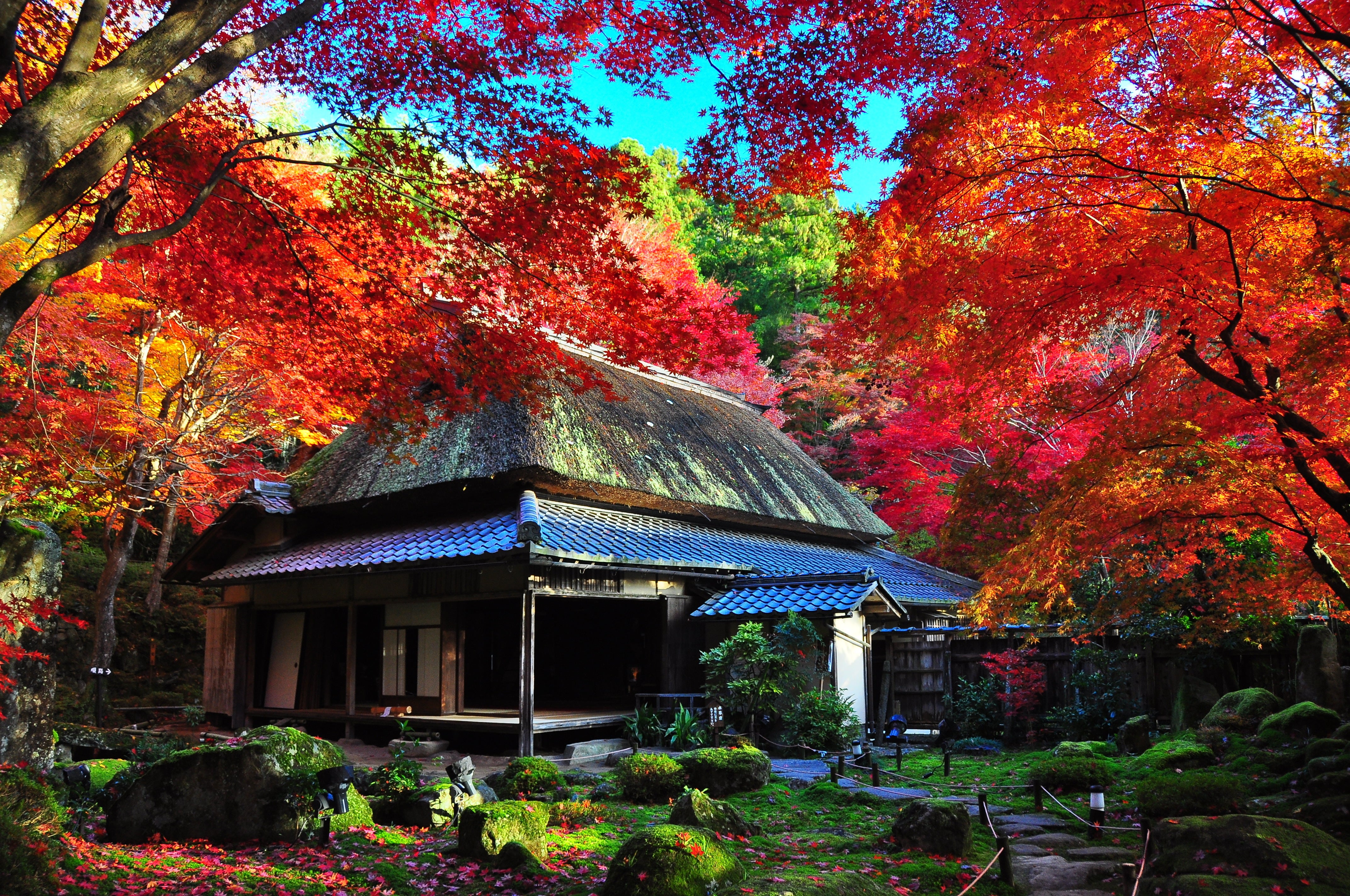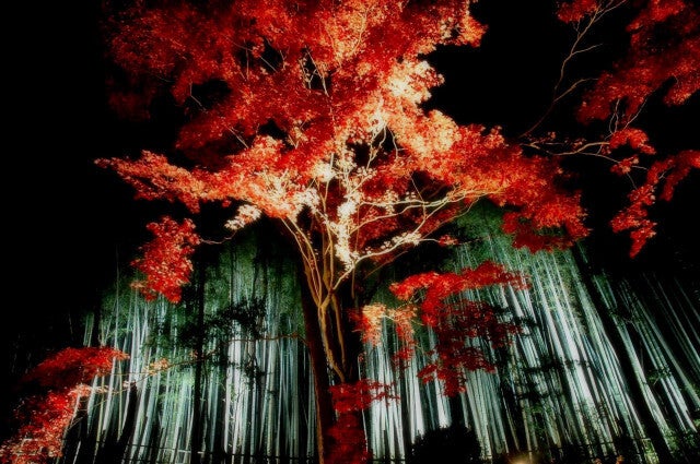 紅葉シーズン(11月1日~12月15日頃まで)には紅葉の絶景スポットとして注目されます。約2000坪の境内を埋める約300本の紅葉の古木が真っ赤に染まり、周りを囲む数千本の竹林とのコントラストは拝観者を魅了します。