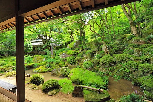 人の行く手を阻む荒れ果てた竹藪を上っていったその先に突然まばゆい緑の空間が現れました。朽ちた廃屋と人の手が入っていない庭園を包み込むように空を覆うもみじの新緑が、青いセロハンとなり苔むした地上をより一層輝かせ、鳥たちの鳴き声も響き渡り、まさに観音浄土ともいうべき優雅な空間が目の前に広がったのです。