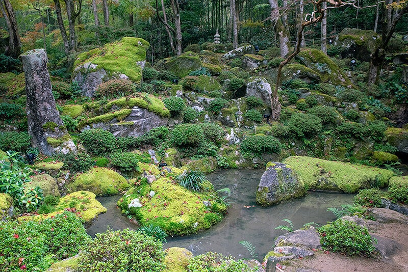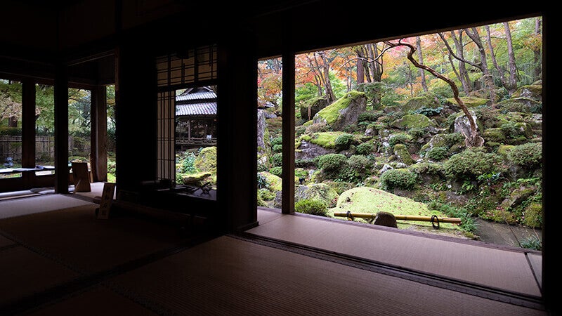 また境内に広がる庭園は小堀遠州作と伝わり、苔むした巨石が連なる豪快な桃山時代の名勝庭園は、茅葺きの書院(江戸初期、市指定文化財)とあわせて、侘びさびの隠れ里の風情を醸し出しています。