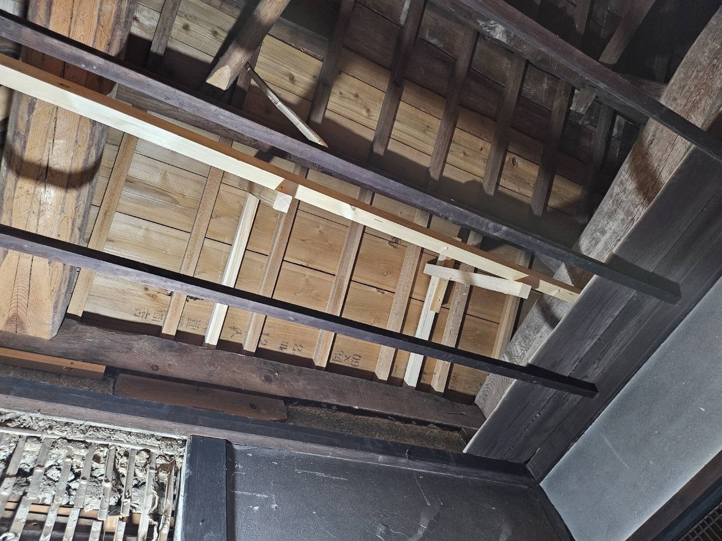 経年の劣化と、住職不在の無人期間の雨漏れにより屋根が傾くほど、骨組みに大きなダメージがあります。これまで応急的な補修で何とかしのいでいるのが現状ですが、昨今の度重なる雨風の影響により、以前にも増して朽ちる部分が年々酷くなり、近いうちに取り返しのつかない状況になるのが目に見えている状況です。