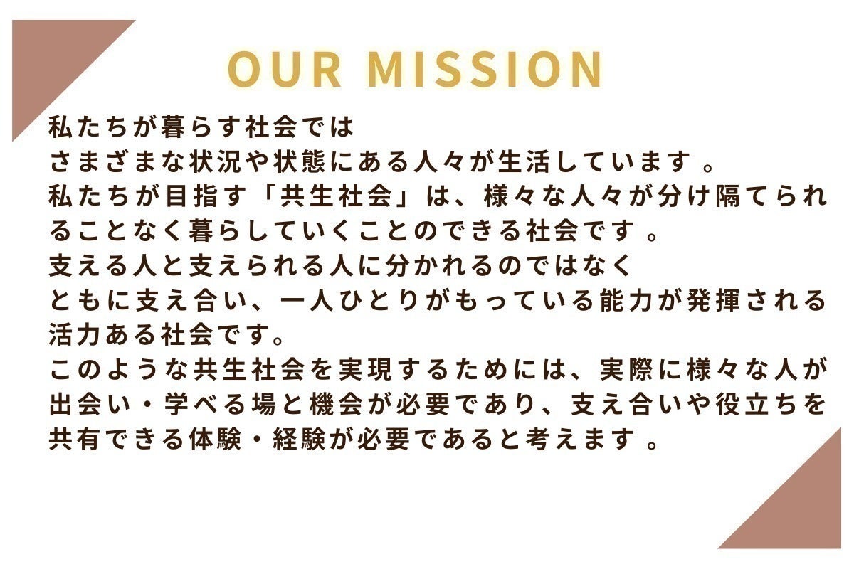 このような共生社会を実現するためには、実際に様々な人が出会い・学べる場と機会が必要であり、支え合いや役立ちを共有できる体験・経験が必要であると考えます 。