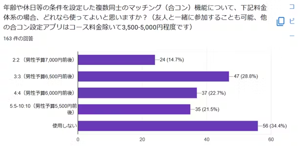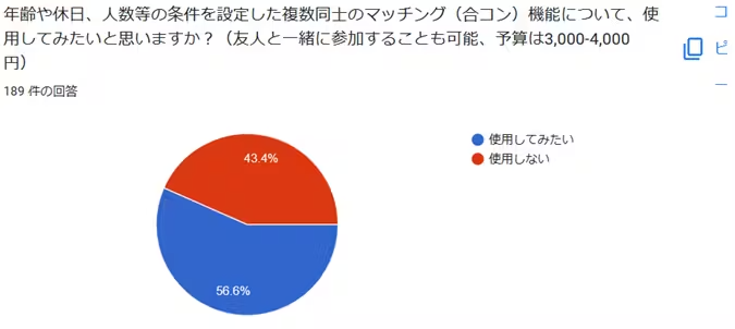 私が合コンをよく設定していたことや知人女性からマッチングアプリに合コン機能がほしい、と言われていたことから、合コン機能を実装することとしました。一度に複数人と出会うことができ、友人と参加することも可能です。なお、349名にアンケートを取り、男性65.6%、女性56.6%の方々から合コン機能を使用してみたい、と回答いただいています。