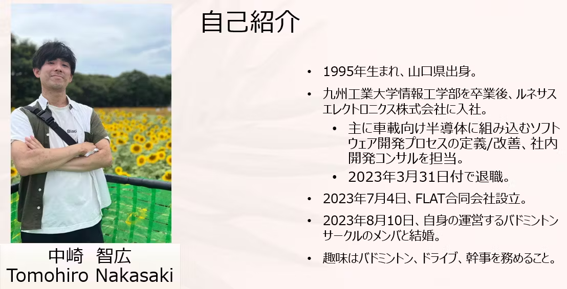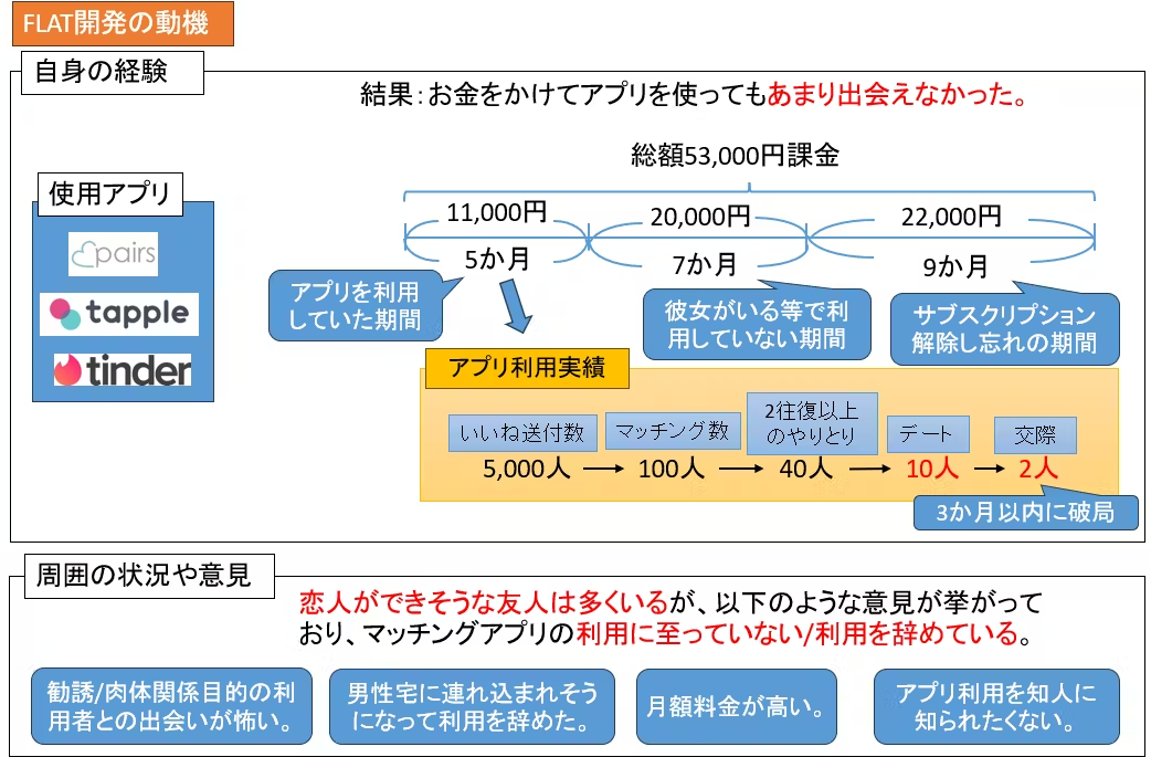 2023年7月にFLAT合同会社を設立し、フツメン向け恋愛マッチングアプリ「FLAT」の企画・運営を主な事業として経営しています。(FLATのLPはこちら、Android版アプリはこちら、iPhone版アプリはこちら)