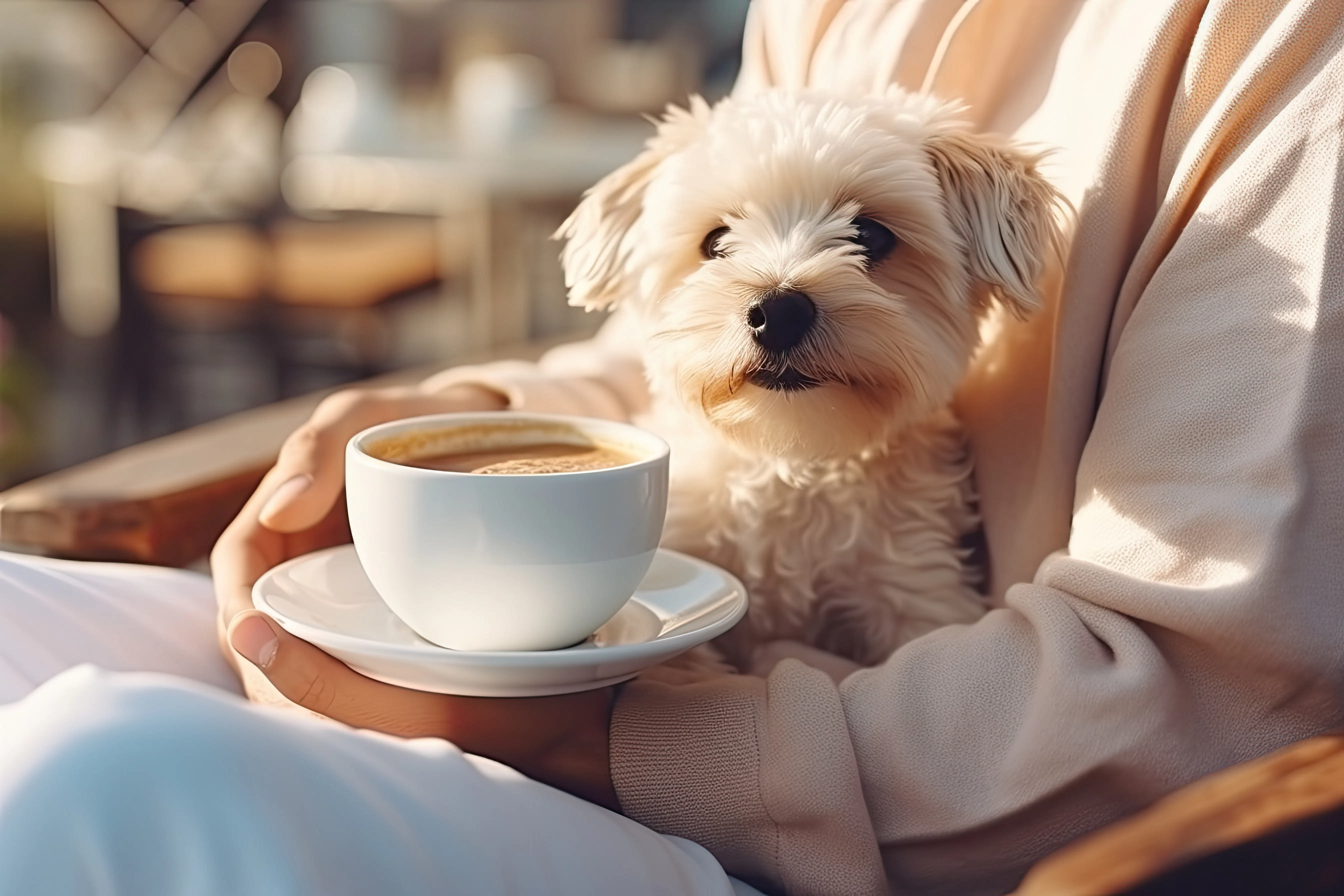 トリミング後にカフェでくつろぎながら、愛犬がドッグランで遊ぶ姿を眺める。