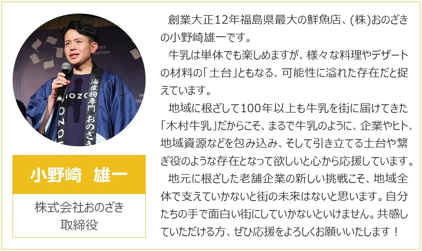 このプロジェクトをご覧いただきまして、ありがとうございます。いわき市平にある牛乳メーカー「木村ミルクプラント株式会社」の曽根原友美です。