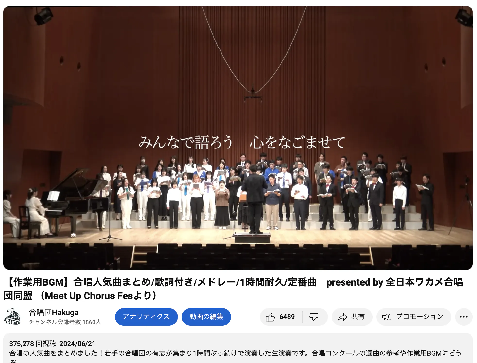 2024年4月 『MeetUp Chorus Fes』で中学合唱コンクール人気曲1時間耐久演奏リレーを実施。演奏動画はYouTubeで2024年9月末現在37万回再生を超える。