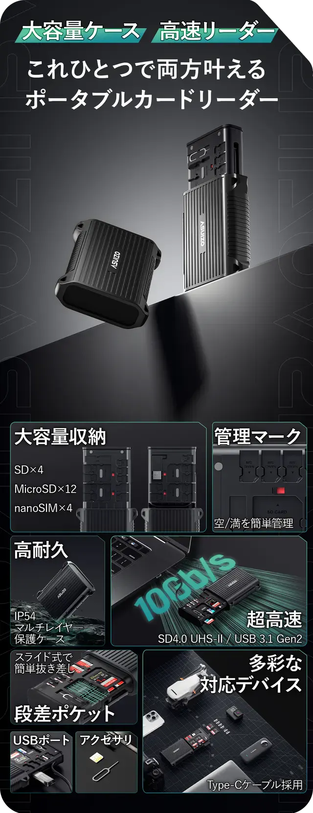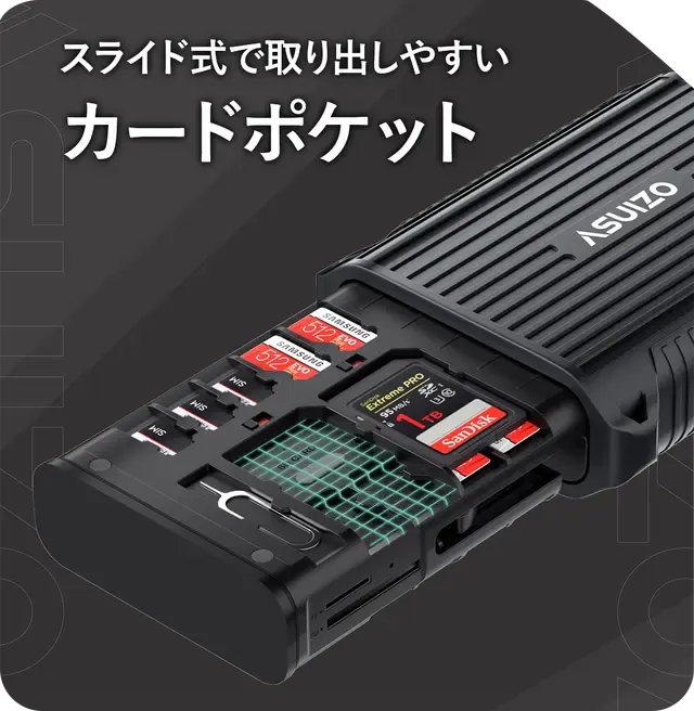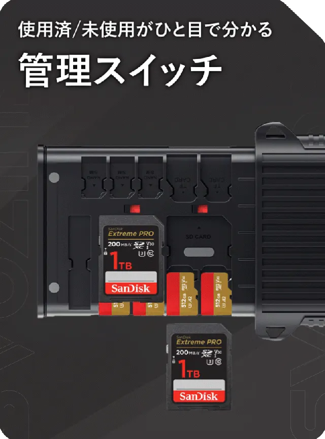 大容量SDカード×4、Micro SDカード×12、Nano SIMカード×4を収納可能!