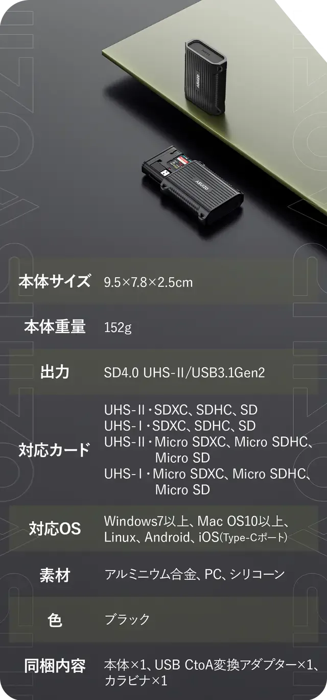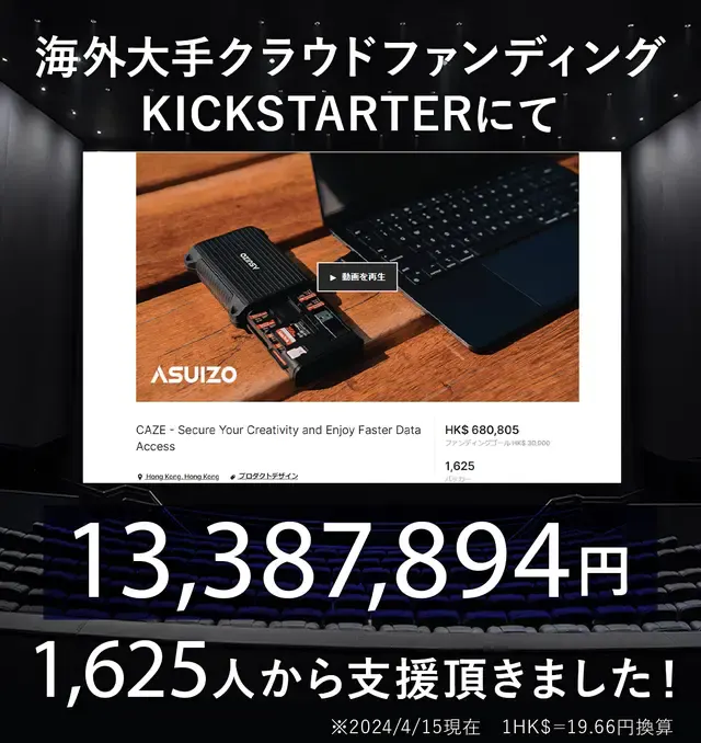 A:CAZEは、最大312MB/秒のSD4.0 UHS-IIおよび、最大10Gb/秒のUSB 3.1 Gen 2を搭載しています。(最大速度のため、ご使用の環境により異なります。)