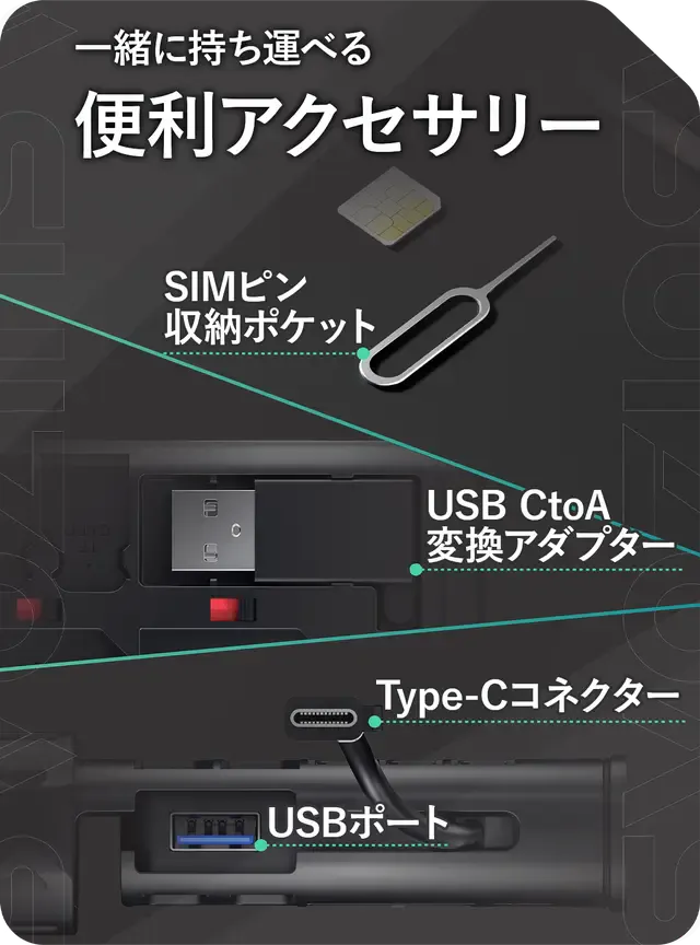 さらに、SIMピン、USBアダプター用のポケットもあり、付属品も一緒に持ち運べます。