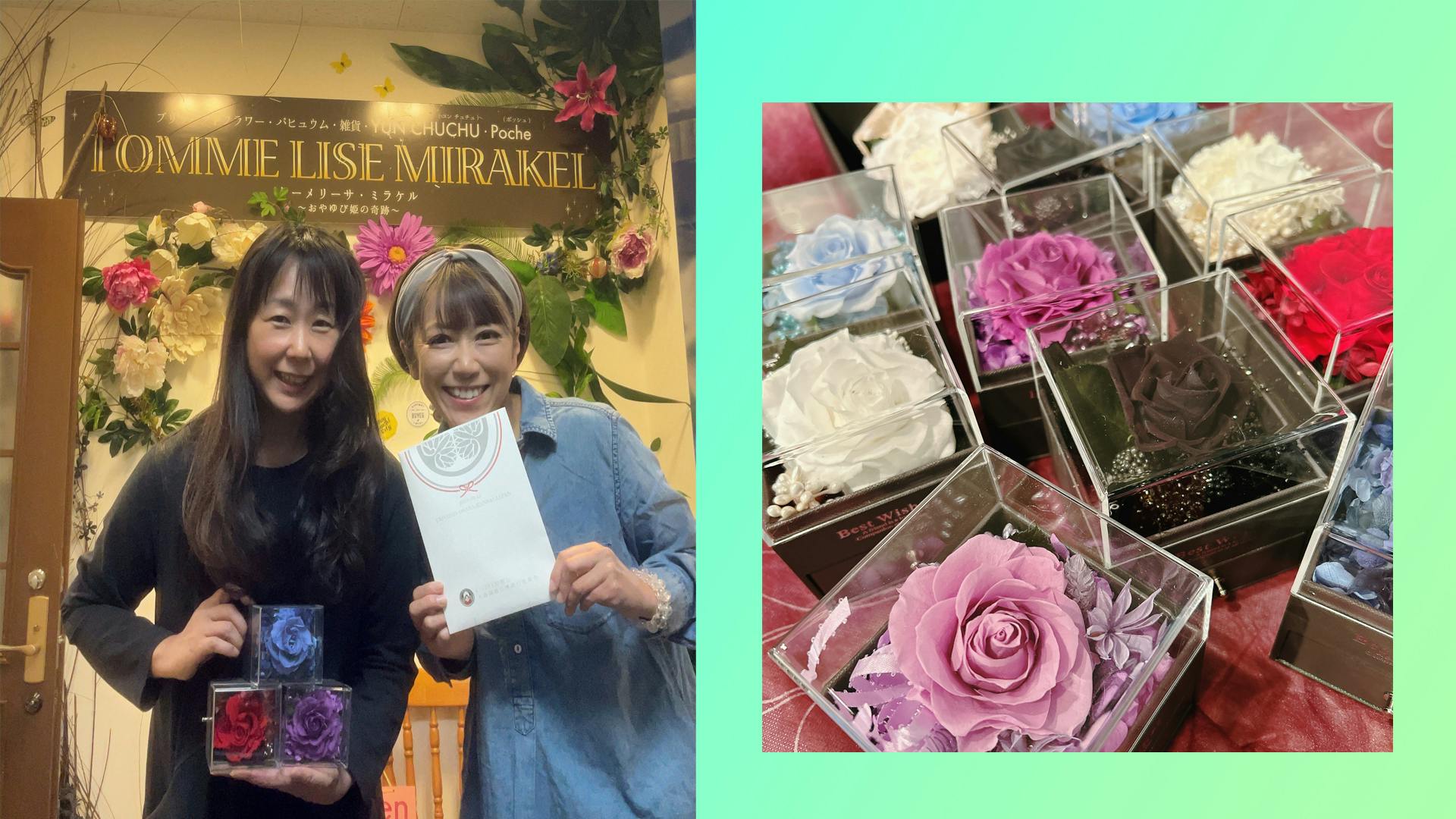 クラウドファンディングの返礼品としてご用意した「クラファン限定!!魂のフラワー占い」。魂の9色を統計学で導き出し、性格や感動の方向性などを読み解く鑑定書とともに、“あなたの運気を高めるカラー”のプリザーブドフラワーを一輪お届けしています。このお花の制作を担当してくださったのが、【トーメリーサ・ミラケル】様。実行委員会でも一緒に活動しておりますが、今回特別に返礼品でもご協力いただけることになりました。先日、返礼品完成のお礼にお店へご挨拶に伺い、丁寧にお花を仕上げてくださったこと、そしてこの企画に共感し協力してくださったお気持ちに、改めて深く感謝をお伝えしてきました。トーメリーサ・ミラケル様のお花は、見た目の美しさはもちろん、ひとつひとつに「願い」や「想い」が込められており、まさに今回の“魂の色”とのコラボレーションにぴったり。ぜひ、お近くにお越しの際はお立ち寄りください。癒しとときめきが詰まった素敵なお店です。これからも、このご縁を大切にしながら、プロジェクトを進めてまいります。引き続き応援のほど、よろしくお願いいたします。トーメリーサミラケル(TOMMELISE MIRAKEL)〒640-8331和歌山県和歌山市美園町5丁目2−2営業時間:(例:11:00~18:00)TEL: 073-431-5324定休日:不定休URL:https://www.mirakel.jp/Instagram:@tommelise_mirakel