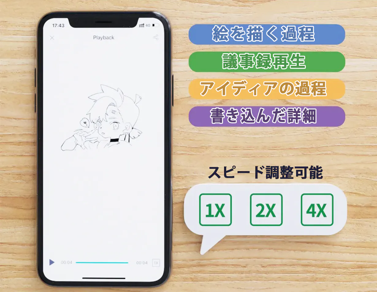 DIGIPENに手書きした内容を専用アプリに同期しデジタル化すれば、手書きした過程をリプレイ可能です。