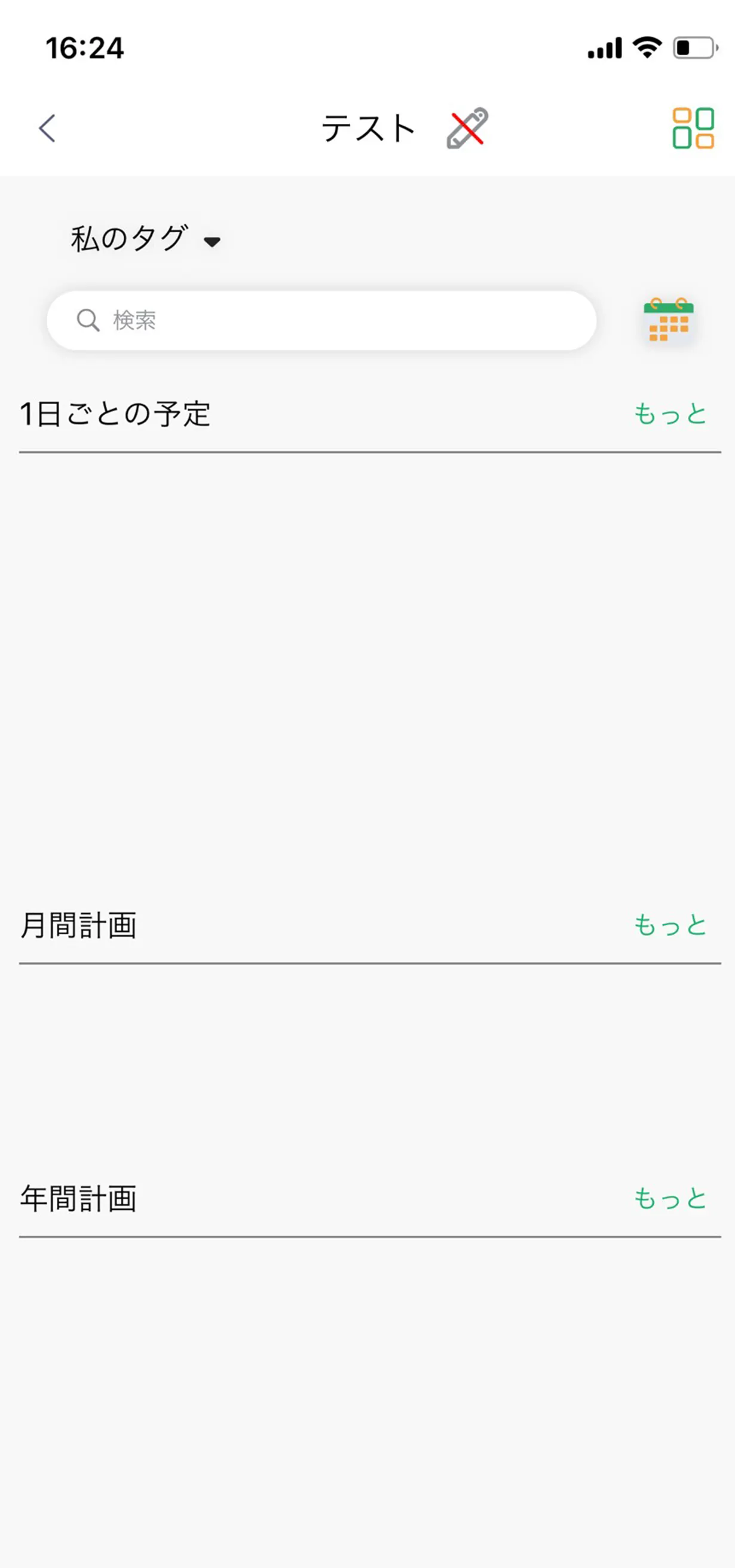 登録ノート3つの中から、"タグ検索機能テスト"というタグで検索し、該当する3つのページを見つけています。