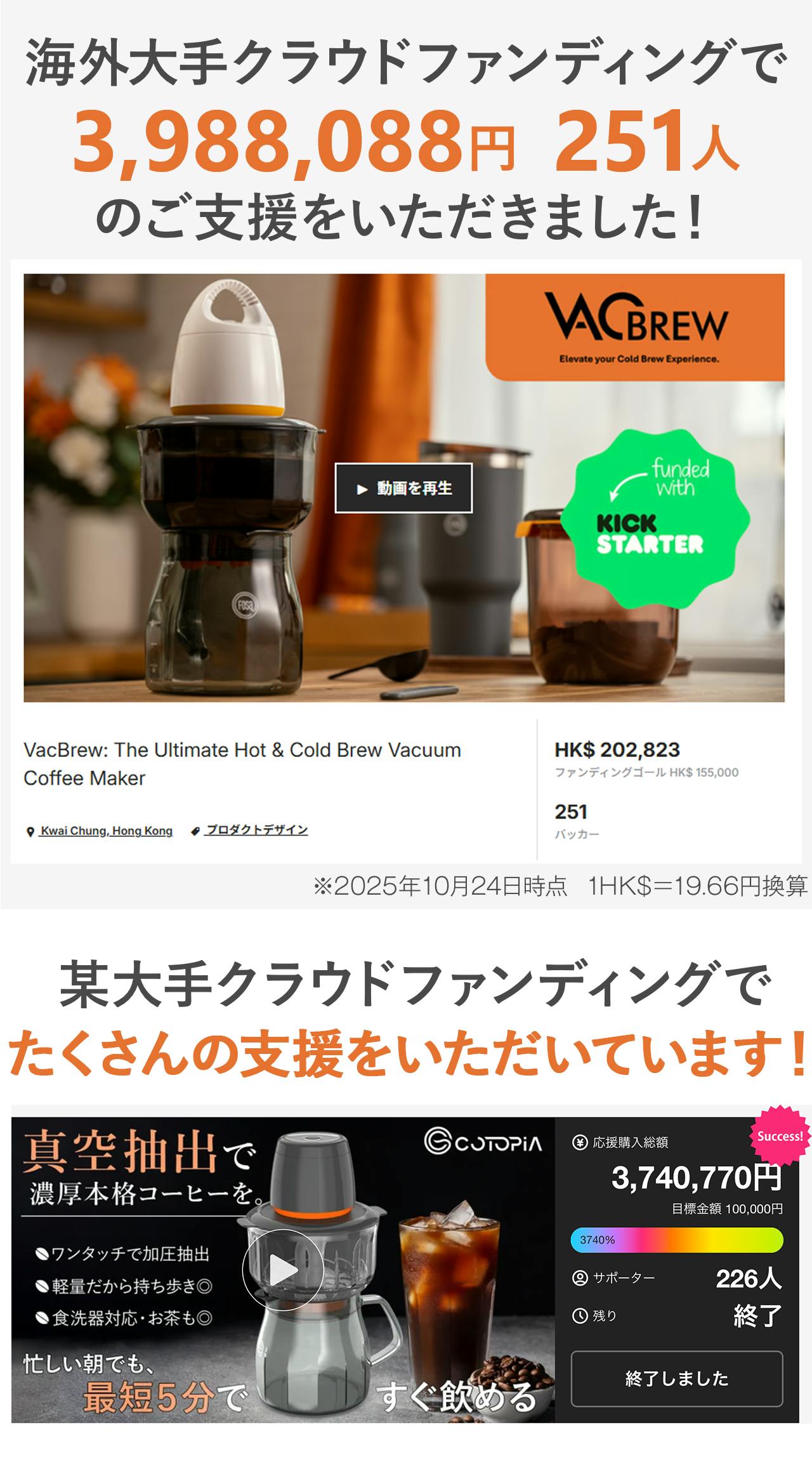 今回は皆さまに「特許技術による真空抽出で、最短5分で風味豊かなコールドブリューを作れるコーヒーメーカーとワンタッチで香りも鮮度も守る、次世代コーヒーキャニスター」プロジェクトを紹介させて頂きます。