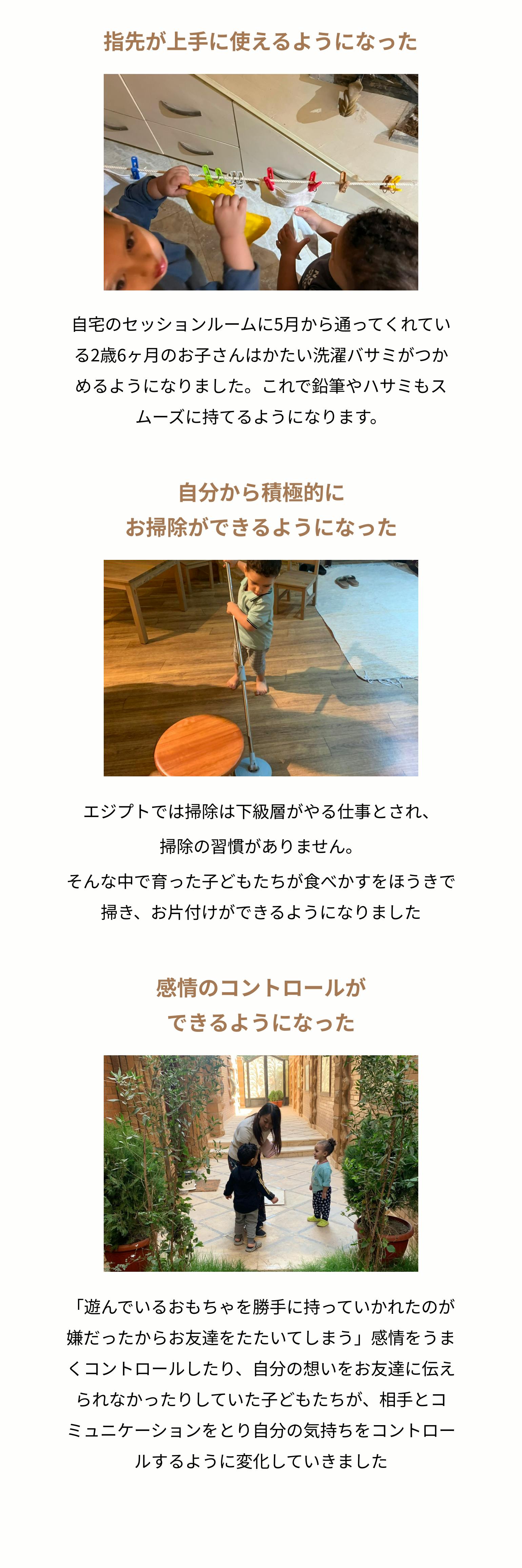 エジプトに渡って、日本の保育を広めたいと聞いた時はびっくりしましたが、エジプトの教育が良くなる活動をしてくれるマキさんを心から尊敬しました。文化が全然違うエジプトで日本の保育を伝えるのは本当に大変。でもパイオニアとしてこの活動を成功させてエジプトの子どもたちが幸せになることができたら私も嬉しいです。